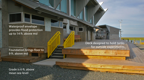 Wells says “ensuring that the new lab is flood-resistant was a key factor in its planning and construction. As with the building’s other functional elements, the planning and construction teams did a great job in incorporating flood-proofing features into the structure’s form and design.”