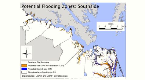The report includes numerous maps showing areas of potential flooding in light of sea-level rise. The maps assume a 1.5-foot rise in sea level and a 3-foot storm surge. These represent moderate assumptions, with the value of sea-level rise well within the range of the best available forecasts for Virginia over the next 20 to 50 years.
