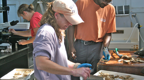 This year’s trainees are Marisa Franks of Williamsburg; Cyrene Grover of Lisbon Falls, Maine; Janet Hanson of Largo, Florida; and Jim LaChance of Beverly, Massachusetts. “The 2013 interns are unique in that they all have previous experience with oysters,” says VIMS Hatchery Specialist Amanda Chesler. “Some have worked on oyster farms, while others have collected wild oysters and worked on oyster-restoration projects.”