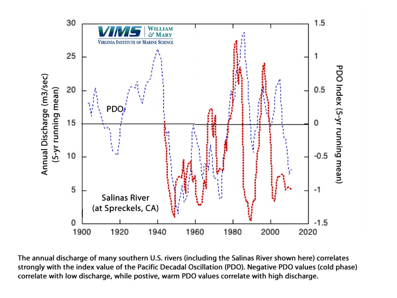 “Oceanic drivers affect precipitation and discharge on the West Coast,” he says. “The PDO is the controlling force, with almost a perfect correlation between a cold PDO and low discharge in rivers across the southern tier of the U.S.—including the San Diego, Salinas, San Juan, Colorado, and Suwanee.”