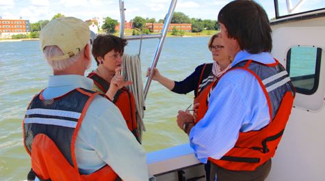 Following a visit to the VIMS Oyster Hatchery, where she learned about advances in oyster husbandry and breeding from Dr. Stan Allen, the Secretary boarded a VIMS vessel for a brief tour of the VIMS shoreline and the York River.