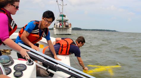 Assistant Professor Donglai Gong then deployed one of his unmanned underwater gliders for a first-hand look at how these next-generation vehicles allow for data gathering during extended missions over large regions. Assisting were VIMS Captain and Marine Safety Officer Jim Goins and graduate students Nicole Marshall, Alex Renaud, and Haixing Wang.