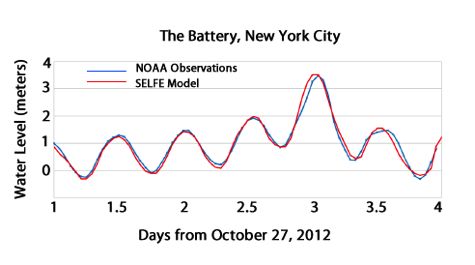 The study, published in today’s issue of the Journal of Marine Science and Engineering, shows that with the right input, the team’s high-resolution computer model was able to simulate water levels to within 6-8 inches of those observed in New York City and surrounding areas during Hurricane Sandy’s approach and landfall in late October 2012. This includes sections of Manhattan where buildings and other infrastructure divert and channel floodwaters in exceptionally complex ways.