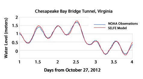 Wang and his modeling team—fellow VIMS researchers Derek Loftis, Zhuo Liu, David Forrest, and Joseph Zhang—conducted their study by “hindcasting” Hurricane Sandy’s landfall along the U.S. Atlantic coast. In this technique, scientists initiate a computer model with data collected before a past event, and then test the model’s accuracy by comparing its output with observations recorded as the event unfolded.