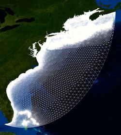 For their test case, Wang and colleagues first used a large-scale model called SELFE to hindcast Sandy-driven changes in water level along the entire East Coast, from Florida to Nova Scotia. They initialized SELFE by entering data on normal tidal conditions along the model’s open-ocean boundary, which is drawn almost 1,500 miles offshore. They allowed the model to "spin-up" for 10 days ahead of Sandy's approach, then another 5 days forward in time once the storm had entered the model grid, adding data on wind speed, wind direction, and air pressure in 6-minute time steps. They derived these data from NOAA’s large-scale NAM (North American Mesoscale) model and a separate fine-scale atmospheric model called RAMS. RAMS—short for Regional Atmospheric Modeling System—was developed by the Poquoson office of Weatherflow Inc., a private-sector provider of weather data.