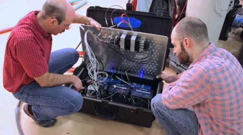 The ROV’s main electronics reside in a plastic case that stays topside. The ROV is tethered to the electronics by about 130 feet of cables. The controlling computer—a laptop with a joystick—connects to the electronics via Wi-Fi so that the operator can operate the electronics-ROV package from a pool-deck, or in the case of experiments at the Ohmsett tank, an observation tower.