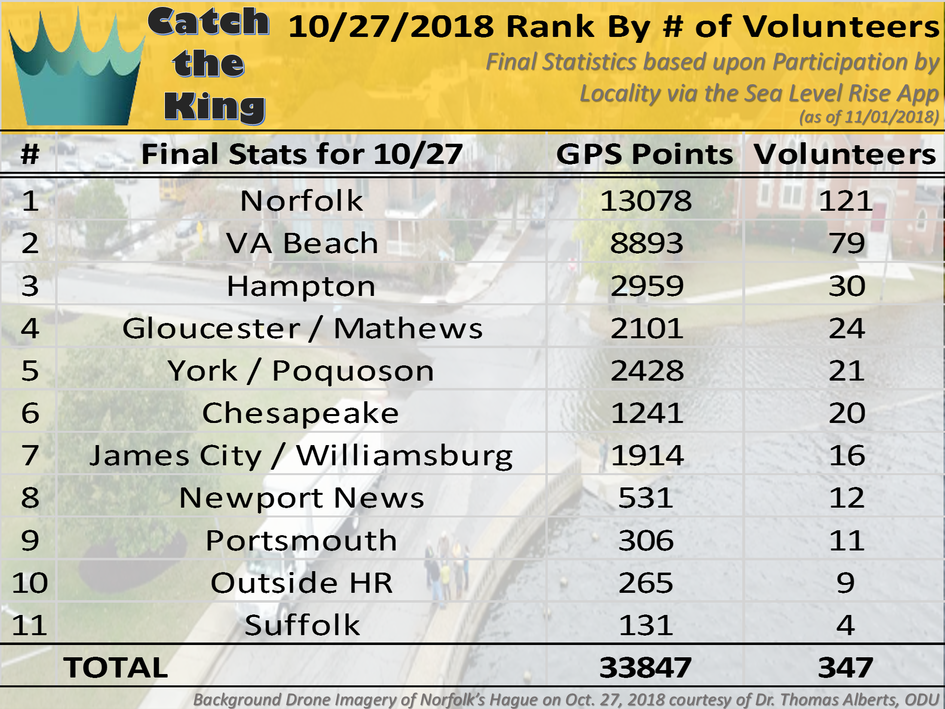 Response from the event's numerous volunteers, fueled by the local media partners' coverage leading up to the event, and 42 separate volunteer training events held all over Hampton Roads resulted in an estimated 347 known participants collecting 33,847 time-stamped GPS maximum flooding extent measurements and 458 geotagged photographs of the King Tide flooding during the event. There were additionally 141 volunteers who collected 3,881 GPS data points during the high tide the day/night before the king! Combined, those totals are 488 participants and 37,728 GPS points during the 2018 Catch the King+Nor'easter event. The total number of unique volunteers across both days was 431 people, meaning 57 volunteers mapped the King on Friday and Saturday, 10/26-27. Final assessments calculated this to be 63% of Catch the King 2017's GPS data, 60% of it's volunteer population, and 30% of its picture count (which was intentionally decreased to reduce peak usage stress on the App's server).