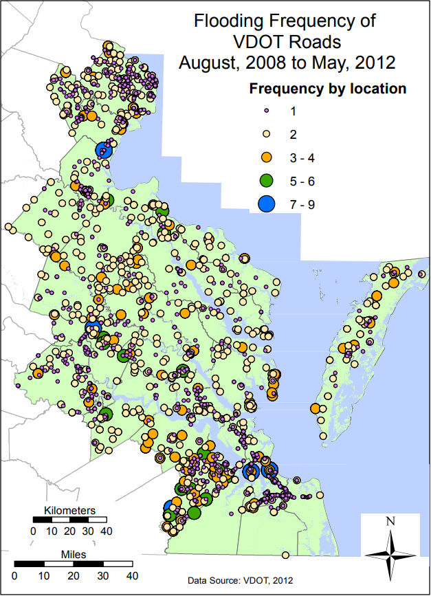 Description: This data report was published in 2013 and includes a map list of locations in Hampton Roads where frequent inundation is known to occur in roadways in Figure 9, pg. 71, of the cited report below showing VDOT flooded roadways (by frequency).
