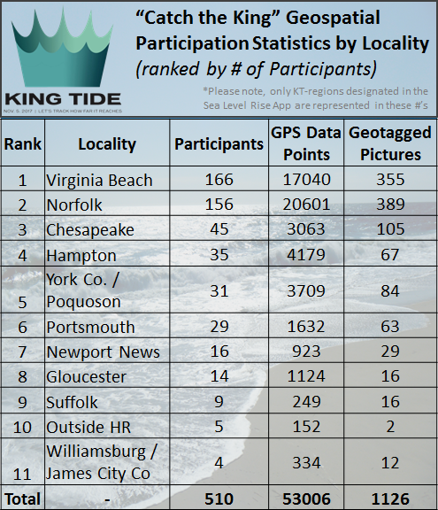 Response from the event's numerous volunteers, fueled by the local media partners' coverage leading up to the event, and 42 separate volunteer training events held all over Hampton Roads resulted in an estimated 347 known participants collecting 33,847 time-stamped GPS maximum flooding extent measurements and 458 geotagged photographs of the King Tide flooding during the event. There were additionally 141 volunteers who collected 3,881 GPS data points during the high tide the day/night before the king! Combined, those totals are 488 participants and 37,728 GPS points during the 2018 Catch the King+Nor'easter event. The total number of unique volunteers across both days was 431 people, meaning 57 volunteers mapped the King on Friday and Saturday, 10/26-27. Final assessments calculated this to be 63% of Catch the King 2017's GPS data, 60% of it's volunteer population, and 30% of its picture count (which was intentionally decreased to reduce peak usage stress on the App's server)