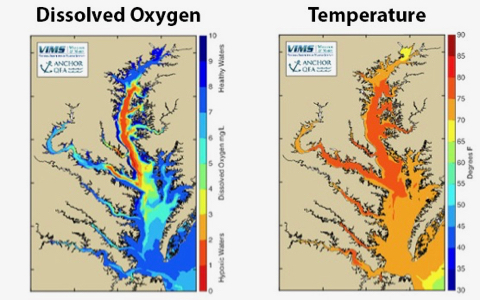 Quick IntroductionBecause low-oxygen waters impact fish and other marine animals, the Virginia Institute of Marine Science and partners are developing computer models to accurately predict when and where low-oxygen or "hypoxic" conditions may form. Their goal is to help anglers and others better plan on-the-water activities. Part of the broader Chesapeake Bay Environmental Forecast System, this product simulates dissolved-oxygen levels in the bottom waters of the Bay's main stem. It simulates 3 conditions: