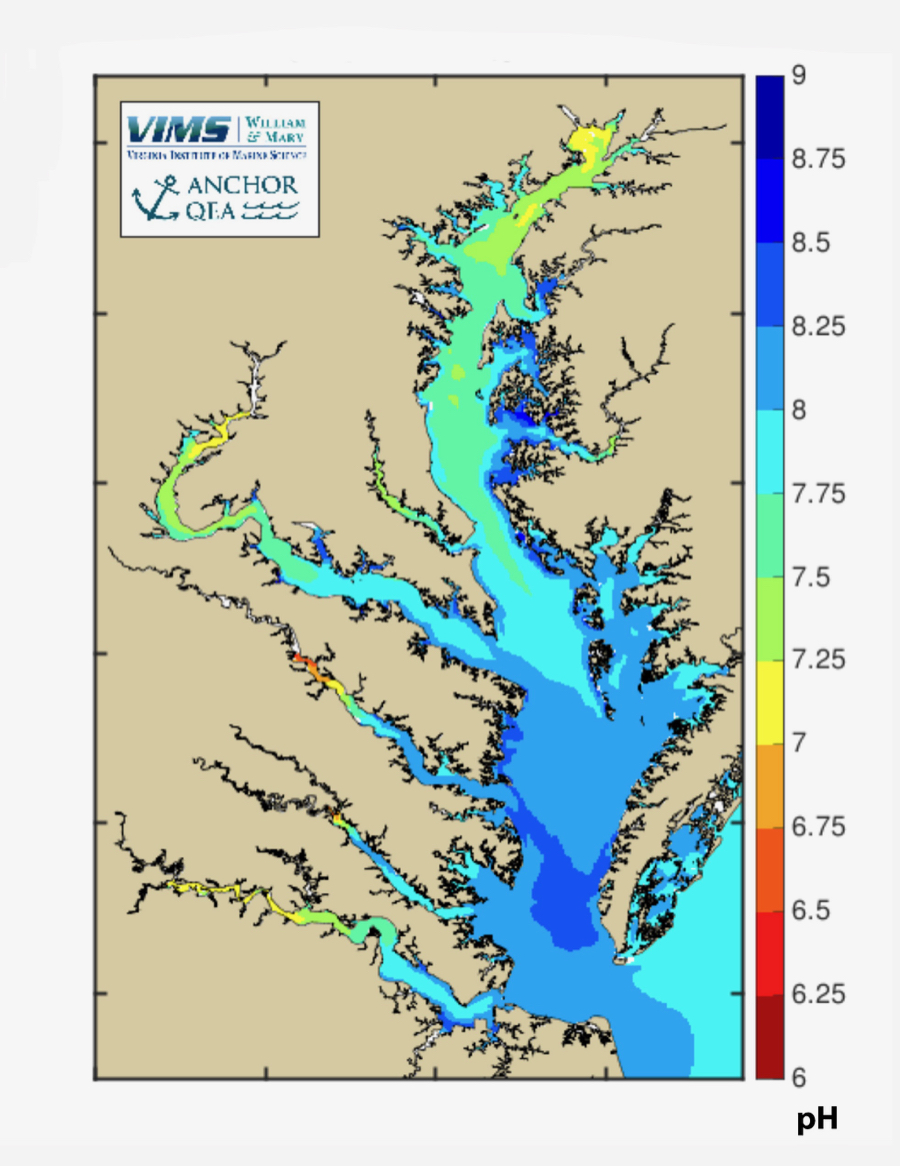 Maps and line-plots of acidification metrics such as pH in the Bay and its lower tributaries