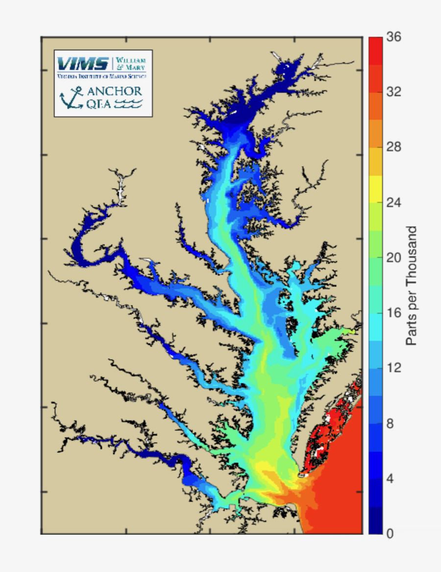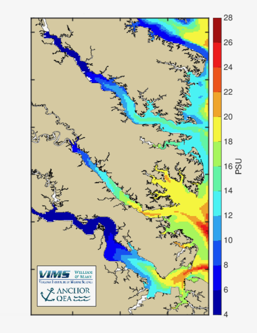 View a close-up of surface salinity in the James, York, and Rappahannock rivers.