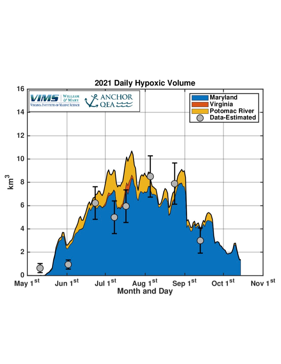 Track "hypoxia" in the Bay, as measured by the volume of waters where DO levels are below 2 mg/L.