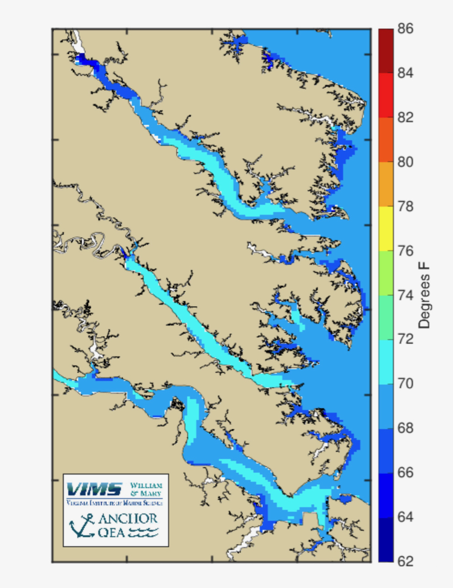 View a close-up of surface temperature in the James, York, and Rappahannock rivers.