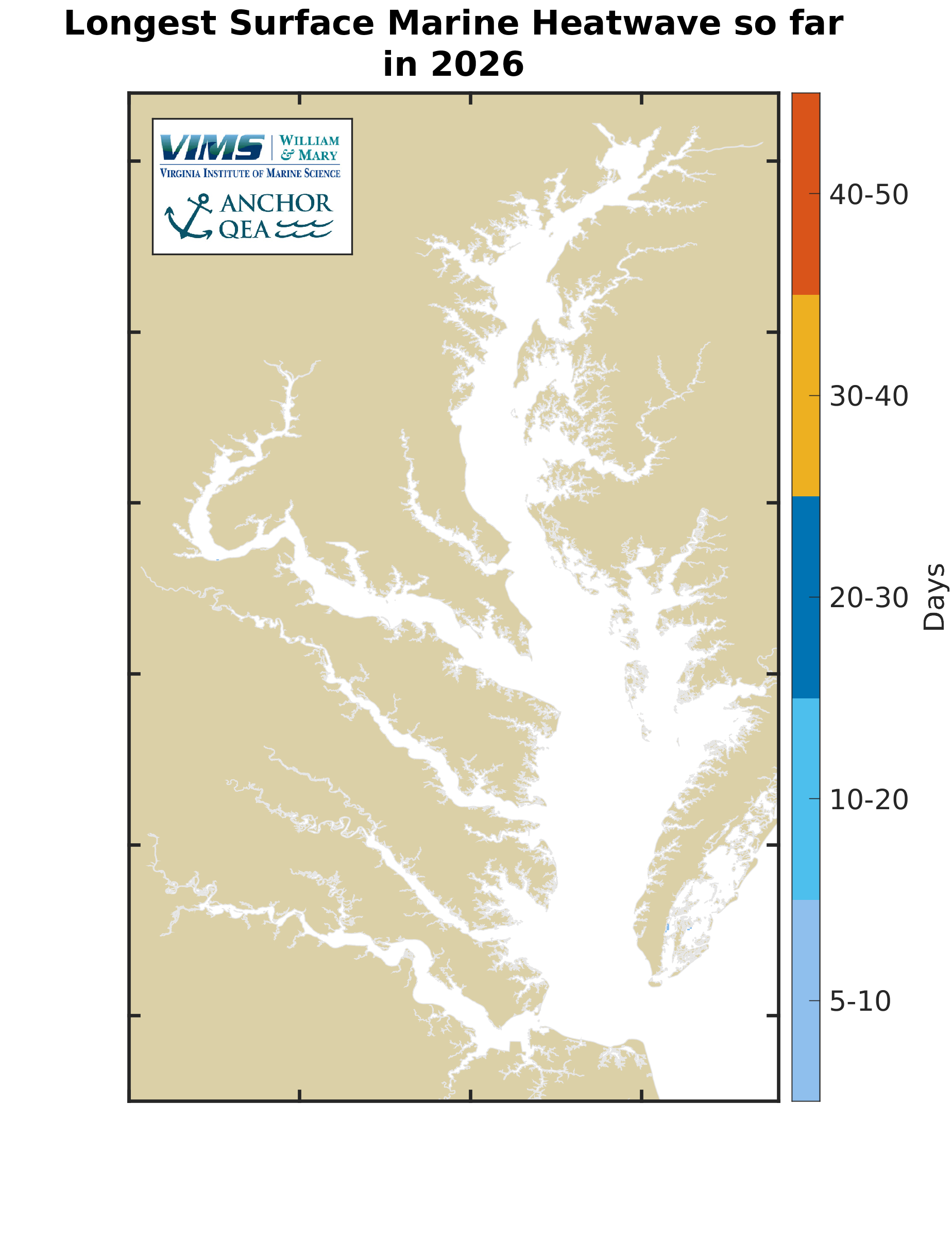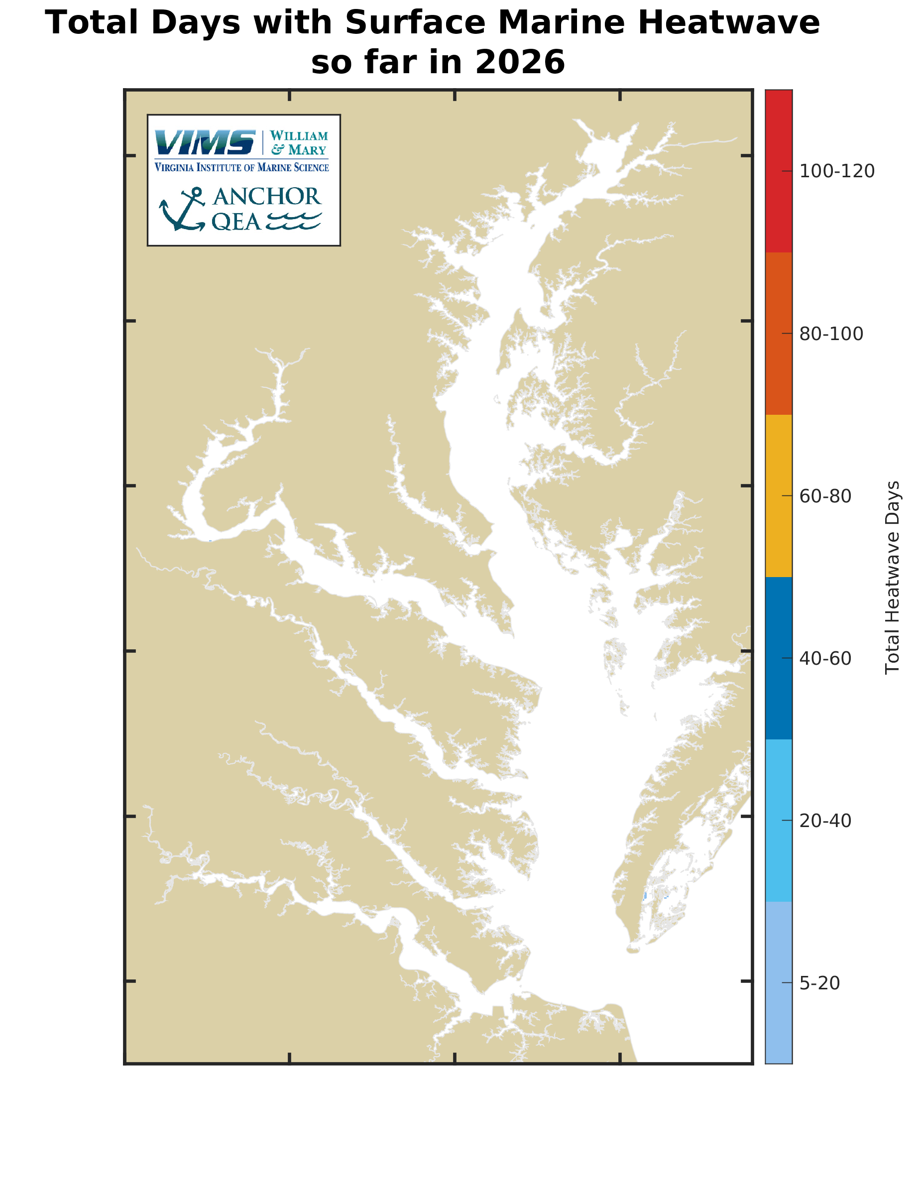 For CBEFS to forecast a marine heatwave, the area of water experiencing a marine heatwave must be above 1000 acres, approximately 0.04% of the Bay surface area. This allows the forecasts to focus on more significant marine heatwave events and not small-scale localized elevated water temperatures. The duration of marine heatwaves is measured in the number of days that an area has been in a marine heatwave. Maps provide the number of days that currently forecasted areas have been in a marine heatwave. Additional maps show the longest duration marine heatwave so far this year and the total number of days so far this year that an area has been in a heatwave. |