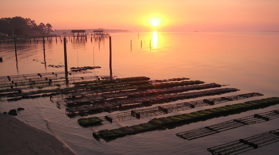 Farm SitesThe York River farm is located near the VIMS campus and is used for disease-challenge tests under conditions of moderate salinity and high disease prevalence and is also used as an easily-accessible location for archive material. This site employs all three of ABC’s grow-out methods, with bottom cages and racks in breakwater pools, and a large longline system installed in an adjacent area just offshore of Watermen’s Hall. The Rappahannock River farm is ABC’s primary broodstock holding site. Its moderate salinity, protected location, and lower disease pressure make it a great site to grow seed and hold the majority of ABC’s spawning and distribution stocks. Tetraploid seed and broodstock are also concentrated at this site, where they benefit from its stable conditions. Bottom cages and racks are spread throughout this site in highly organized groups, each located in the ideal spot for their specific purpose. The Lewisetta farm on the Coan River is one of ABC’s lower salinity sites. It serves as a deployment site for low-salinity seed each year, a test site for the family breeding program, and a holding site for some of ABC’s low salinity line broodstock. Bottom cages and racks run in long rows on this site, parallel to the shoreline. ABC’s second low salinity site is located on the Choptank River at the Horn Point Lab in Cambridge, Maryland. ABC helped install a second longline system at this location, which is used by scientists from both research groups. ABC uses a portion of this longline space as another low-salinity test site for their family breeding program. The extreme low-salinity conditions that can occur at this site also make it an informative location for experimental work. VIMS also possesses a pier and adjacent property on Sarah's Creek, a branch of the York River. There, the primary gear type are Taylor floats and the site is used for temporary holding of oysters as well as a place to naturally condition oysters. Due to the low streamflow, this site is particularly nutrient rich and warm, making it an ideal location for oyster conditioning. |