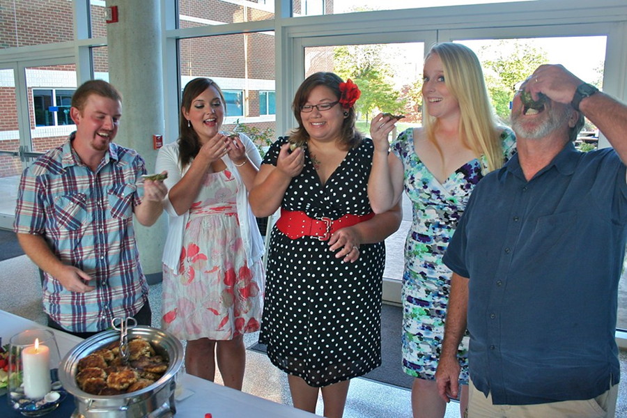 OAT Program reception 2012. From left - Chris Smith, Nicole Dunleavy, Marga Morris, Elyce Whatley (all OAT '12), and Stan Allen, enjoying some oysters in celebration of another great summer season.Not only are oysters important ecologically and aid in maintaining water quality, but you can eat them! Raw oysters, when harvested by a certified shellfish harvester and sold at retail establishments, are safe to eat all year. You can fry, roast, bake, broil, or grill oysters, if you prefer them to be cooked! Because oysters are filter feeders, their meat takes on flavor qualities of the water around them. Oysters that are grown in seawater with a high salt content taste very different from those grown in more brackish waters.