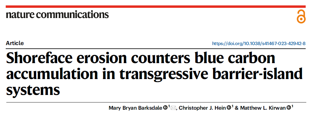 December 19, 2023: Congratulations to Coastal Geology Lab PhD Student Mary Bryan Barksdale, whose first dissertation chapter was published online today at Nature Communications! This is a very neat study of the erosion of marsh and lagoonal deposits along the beaches and shorefaces of the rapidly migrating Virginia Barrier Islands, with implications for blue carbon storage.