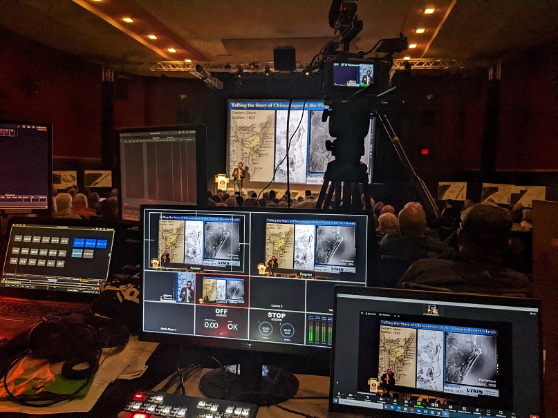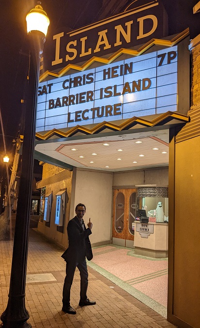October 30, 2022: Big time! Chris made the marquee of the Island Theater in Chincoteague, where he presented the Coastal Geology Lab's recent research to a sold-out (~200 person) crowd. Photos credit of Emily Hein, VIMS.