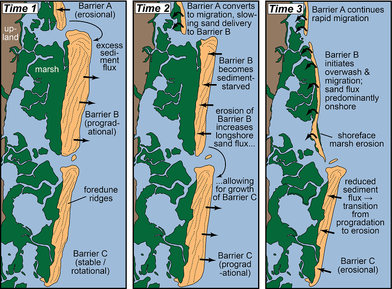 December 8, 2016: Charlie Deaton's 2015 William & Mary senior research was published online today in the journal Geology. A fantastic achievement by this young scientist! This work traces barrier island and marsh change on the Eastern Shore of Virginia over the last 150 years and tests the so-called "runaway transgression" hypothesis, finding that any couplings between barrier island dynamics and associated backbarrier marshes are entirely overwhelmed by independent barrier-island migration, likely driven by changes in longshore sediment supply. Check it out here: Barrier island migration dominates ecogeomorphic feedbacks and drives salt marsh loss along the Virginia Atlantic Coast, USA. Please feel free to contact us for a pdf copy if you do not have online access.