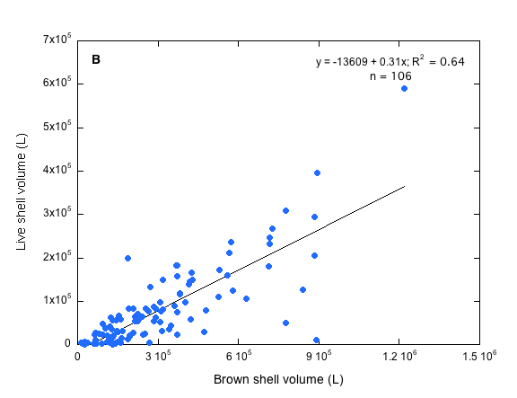 Figure 5B. Brown shell volume (L) versus live shell volume (L) in the Great Wicomico River (region B).