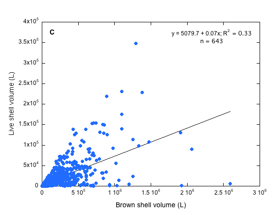 Figure 5C. Brown shell volume (L) versus live shell volume (L) in the Rappahannock River (region C).
