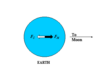 As the image at left shows, we can regard the forces FM and FC to be in balance (FM = FC) for the earth as a whole and acting at a single point at the earth’s center. Similarly, as the earth orbits the sun it experiences solar attractive forces like those of the earth-moon system but of lesser magnitude.