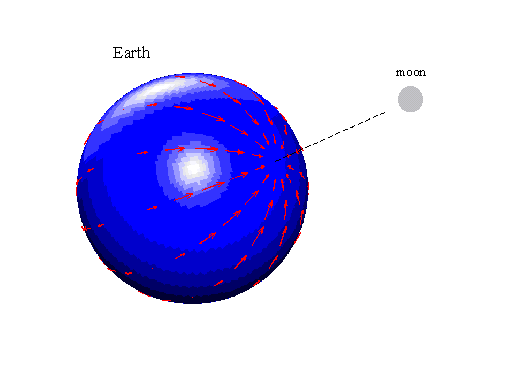 One earth diameter farther away on the opposite side of the earth from the moon, the differential force is about 0.0000001g per unit of mass, acting away from the moon (FC >FM). How can forces so small move huge volumes of water around and produce global tides? The answer lies in the amount of mass and the force direction. Vertical forces in particular are insignificant in comparison to earth’s gravity. Imagine trying to lift a small car off the ground - earth’s gravity proves more than a match for most of us and it’s even hard to push one slightly uphill! But on a level roadway, it becomes a much easier task, particularly if several friends (more mass) are helping to push. So, too, will the ocean volumes (lots of mass) respond readily to the horizontal component of the differential force - the tractive forces shown in red in the diagram below. We can think of these as a net of forces – a force field – thrown over the globe and aligned with the moon, trapping a spinning earth inside.