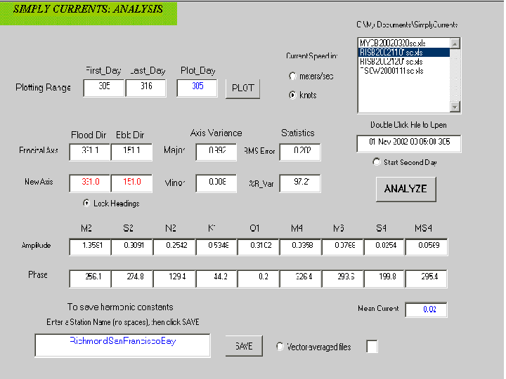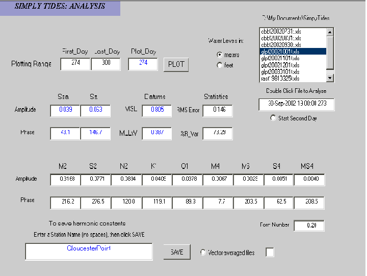 The Tidal Analysis program reads a 29-day water level record and determines amplitude and phase for nine of the major tidal harmonic constituents (M2 through MS4) using HAMELS (Harmonic Analysis, Method of Least Squares). The results appear in the boxes with black numerals. When available from the NOAA National Ocean Service web site (http://co-ops.nos.noaa.gov), the amplitude and phase of the Solar Semiannual (Ssa) and Solar Annual (Sa) seasonal constituents can be added along with accepted NOS tidal datums (MSL, MLLW) at selected stations – the user enters the data manually in the boxes containing blue numerals. You can then save these “tidal constants” (or a vector-averaged series of constants from multiple analyses) in a binary file by entering a station name and pressing SAVE. The user can also generate detailed plots of the observed, fitted, and residual data curves for any three-day segment of the record.