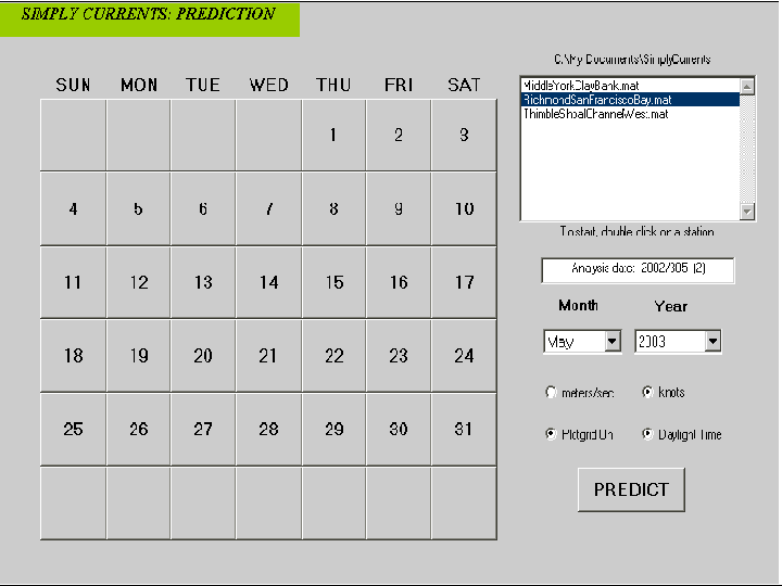 The Tidal Current Prediction program allows the user to make daily predictions of tidal current at any location with a set of tidal current constants derived by the author’s tidal current analysis program. After double clicking on a station name, selecting a month and year, a numbered calendar appears on the GUI when the PREDICT button is pressed. Pressing any of the dates shown will produce an annotated tidal current graph at that station in meters/sec or knots.