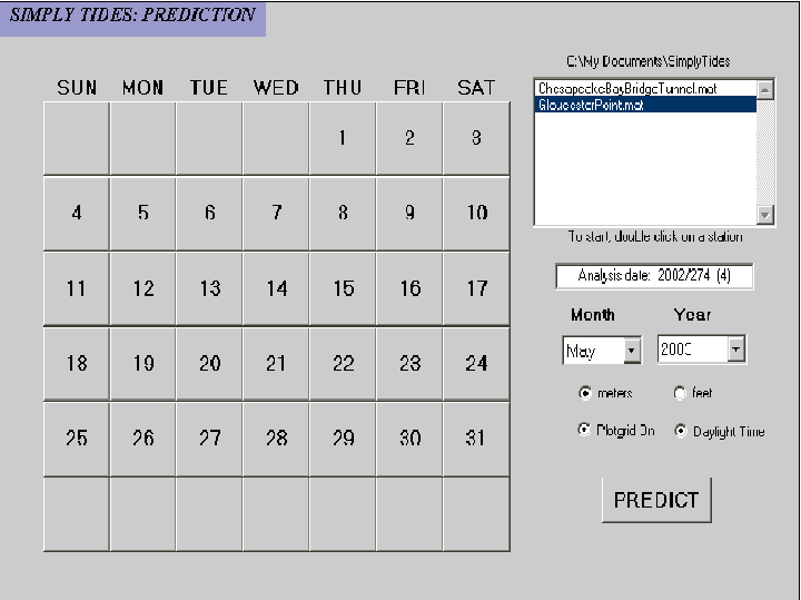 The Tidal Prediction program allows the user to make daily predictions of tidal height at any location with a set of tidal constants derived by the author’s tidal analysis program. After double clicking on a station name, selecting a month and year, a numbered calendar appears on the GUI when the PREDICT button is pressed. Pressing any of the dates shown will produce an annotated tide graph in meters or feet at that station.