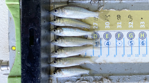 Catch of the day Various sized Young of the Year (YOY) striped bass, {/em} Morone saxatilis {/em}. Photo: Samantha Dowiarz
