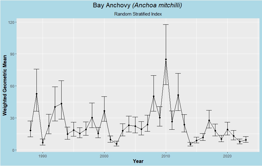 Bay Anchovies are the most abundant fish in Chesapeake Bay and in Juvenile Finfish Trawl Survey catches. From 1995-2011, over 10 million Bay Anchovies were recorded by the survey.