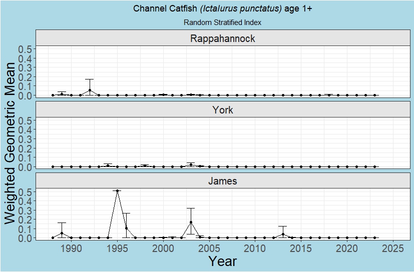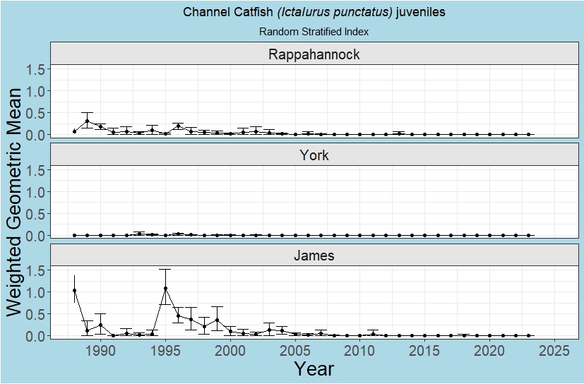 - Because Channel Catfish are restricted in their distribution, an index of abundance is calculated for each tributary. Only stations in the upper portions of the rivers are used.
