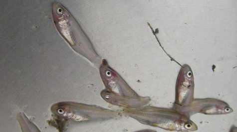 Striped Bass spawn from April through May, and the juveniles often appear in Juvenile Finfish Trawl Survey catches from May to July. These juvenile Striped Bass are only about 25 millimeters (1 inch) long.