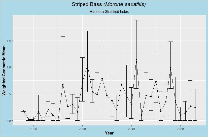 Striped Bass are found throughout Chesapeake Bay and its tributaries year-round. This area is the primary spawning location for Striped Bass along the Mid-Atlantic coast. In the Chesapeake Bay region, Striped Bass are anadromous, migrating from marine to freshwater areas to spawn.