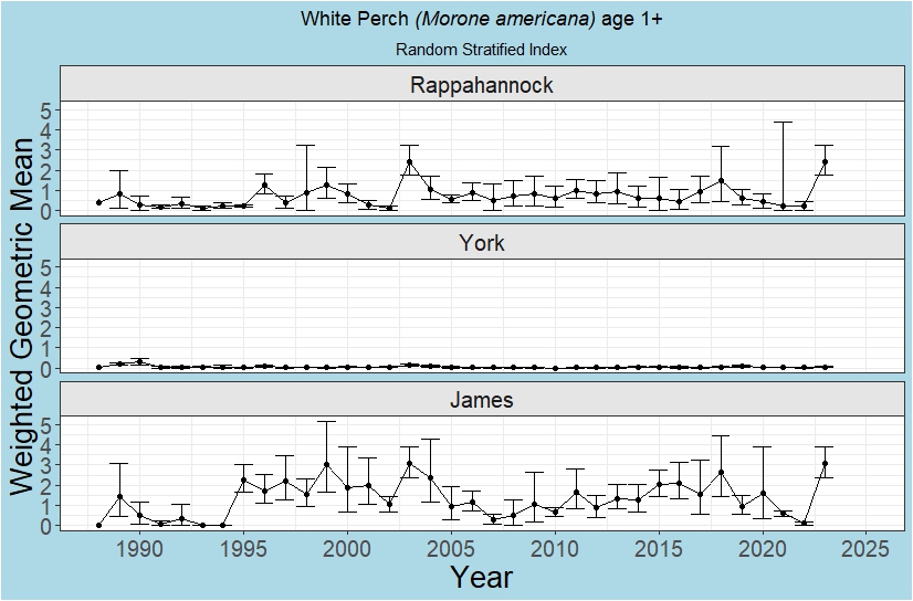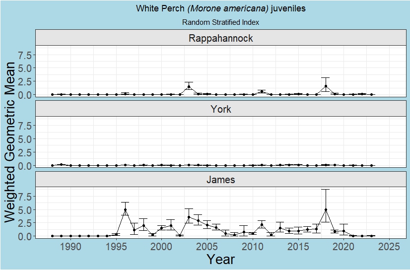 Because White Perch are restricted in their distribution, an index of abundance is calculated for each tributary. Only stations in the upper portions of the river are used.