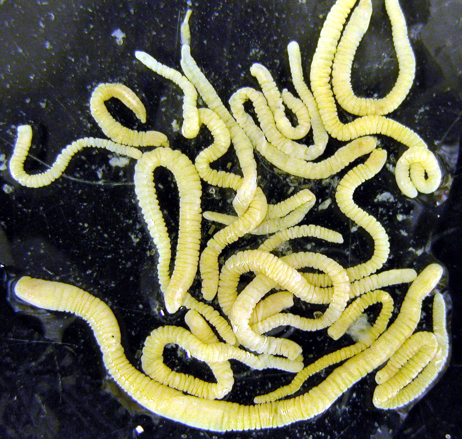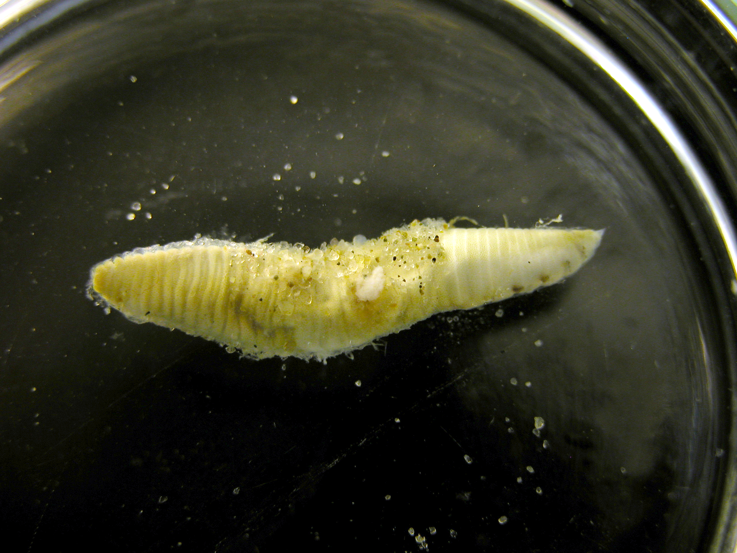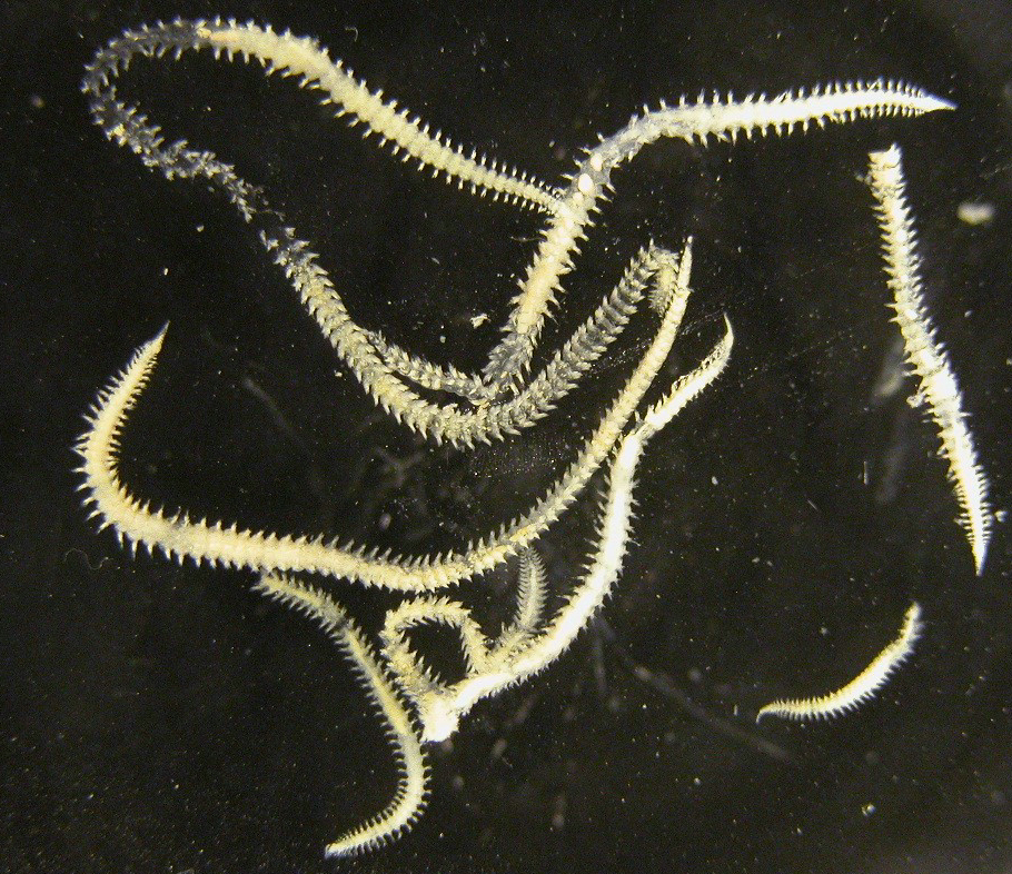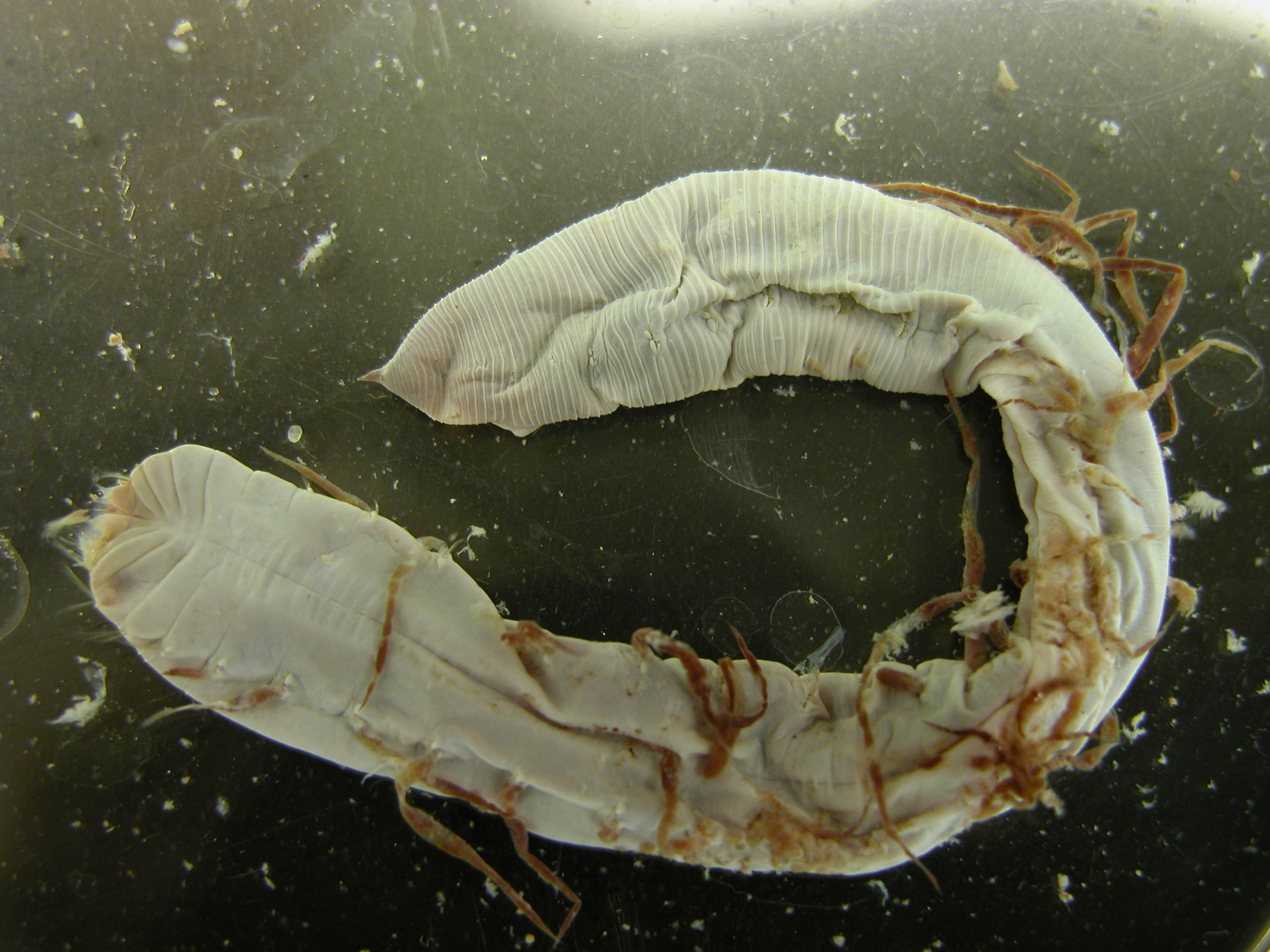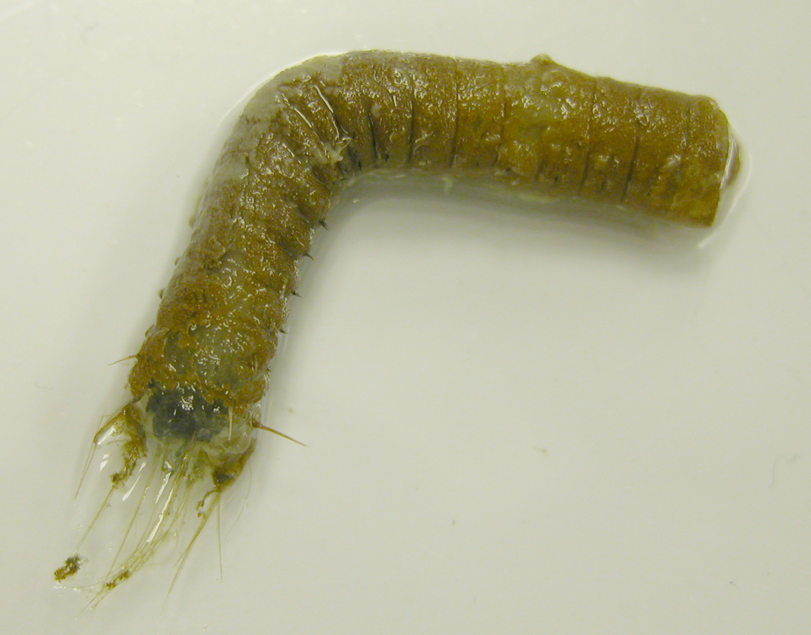 Worms are an important soft-bodied prey source for small and large bottom feeders like Atlantic croaker, spot, winter and little skates, and winter flounder; but large worms are also consumed by voracious predators like striped bass.  The vast majority of worms we identify are polychaetes, or segmented worms; and the vast majority of polychaetes, broken down as they are, are not reasonably identifiable to a lower taxon.  However, common taxa we have been able to identify are Glycera, Pherusa affinis, Arabella iricolor, Ophelia denticulata, Travisia carnea, Nereis, Pectinaria gouldi, and Clymenella torquata.  Our black sea bass sometimes eat Aphrodita hastata, or sea mouse, an atypical and bizarre-looking polychate.  Our infrequent non-segmented worm encounters include sipunculids (peanut worms), nematodes (roundworms), acanthocephalans (spiny-headed worms), and echiurans (burrow worms).  Regarding soft-bodied worms, it is important to note that when performing diet analysis using direct observation of stomach contents, these prey sources are very likely underrepresented.  Because most likely the worms are broken apart and digested more quickly than prey types with a hard shell or scales, we may hypothesize that fishes consume more worms than we can observe and quantify in the stomach contents.