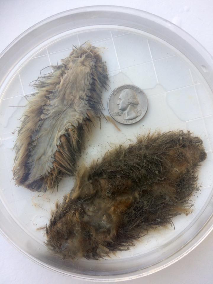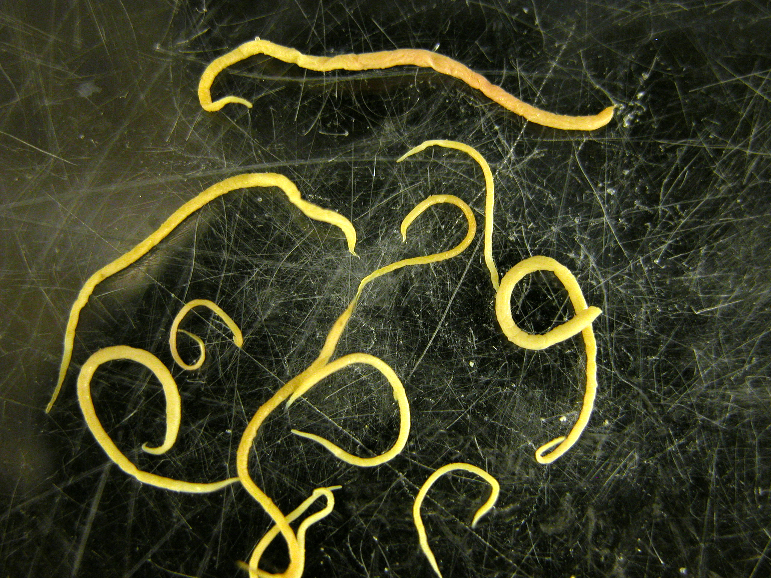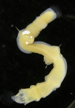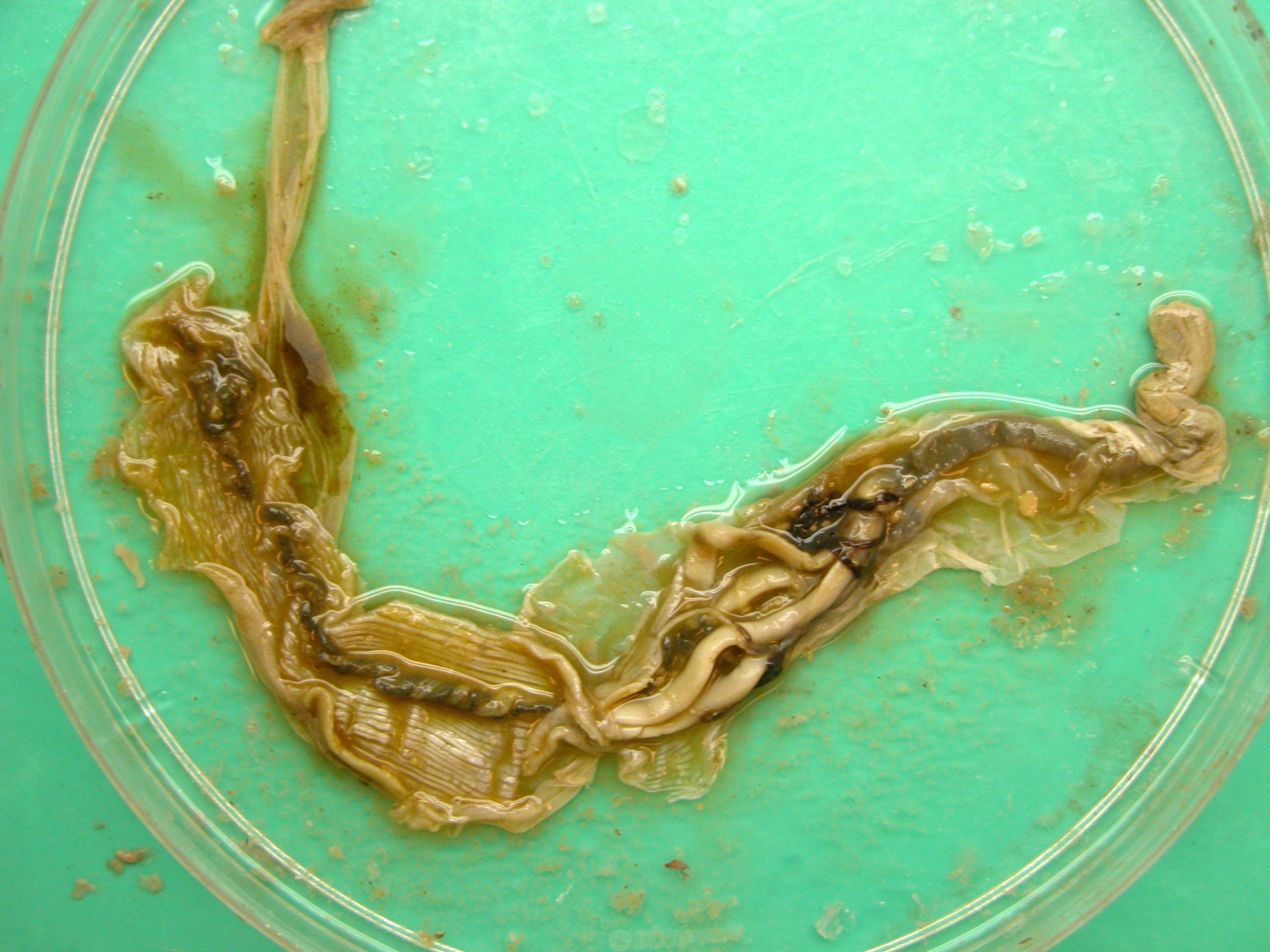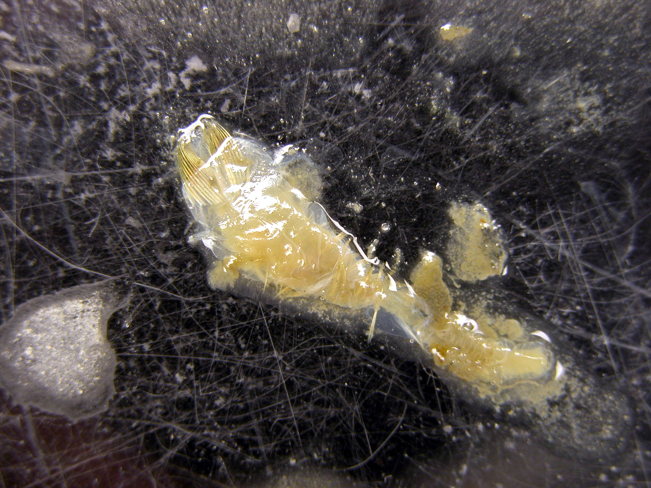 Worms are an important soft-bodied prey source for small and large bottom feeders like Atlantic croaker, spot, winter and little skates, and winter flounder; but large worms are also consumed by voracious predators like striped bass.  The vast majority of worms we identify are polychaetes, or segmented worms; and the vast majority of polychaetes, broken down as they are, are not reasonably identifiable to a lower taxon.  However, common taxa we have been able to identify are Glycera, Pherusa affinis, Arabella iricolor, Ophelia denticulata, Travisia carnea, Nereis, Pectinaria gouldi, and Clymenella torquata.  Our black sea bass sometimes eat Aphrodita hastata, or sea mouse, an atypical and bizarre-looking polychate.  Our infrequent non-segmented worm encounters include sipunculids (peanut worms), nematodes (roundworms), acanthocephalans (spiny-headed worms), and echiurans (burrow worms).  Regarding soft-bodied worms, it is important to note that when performing diet analysis using direct observation of stomach contents, these prey sources are very likely underrepresented.  Because most likely the worms are broken apart and digested more quickly than prey types with a hard shell or scales, we may hypothesize that fishes consume more worms than we can observe and quantify in the stomach contents.