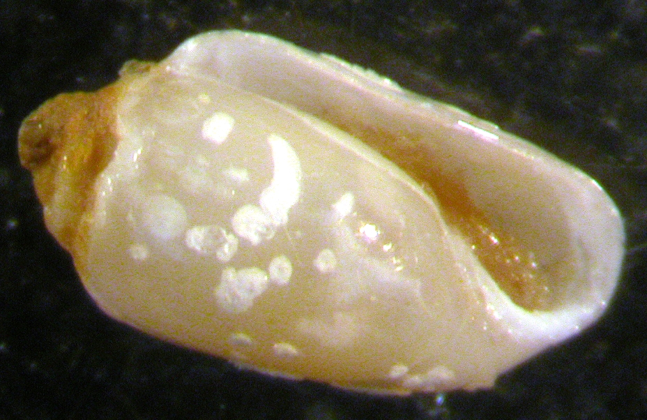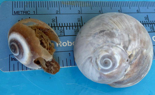 Many common names have been given to these animals, but for us gastropod refers mainly to snails.  Unfortunately the majority of snails we encounter in fish stomachs are too small or crushed to identify to the species level.  However, the barrel bubble is distinct and common enough that we know it when we see it.  Often the shape or size of the snail's operculum, or the hard covering over the opening of the shell, that allow us to identify the moon snail or New England dog whelk, both of which we find relatively frequently.