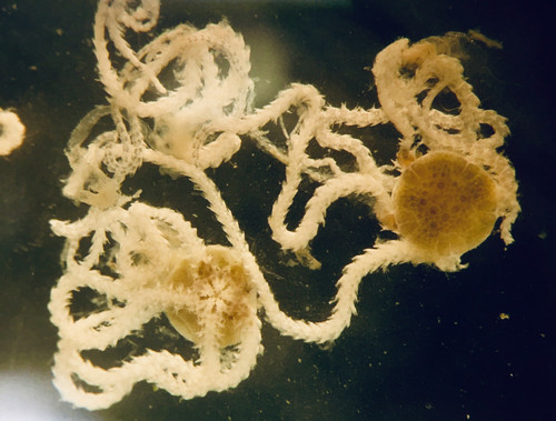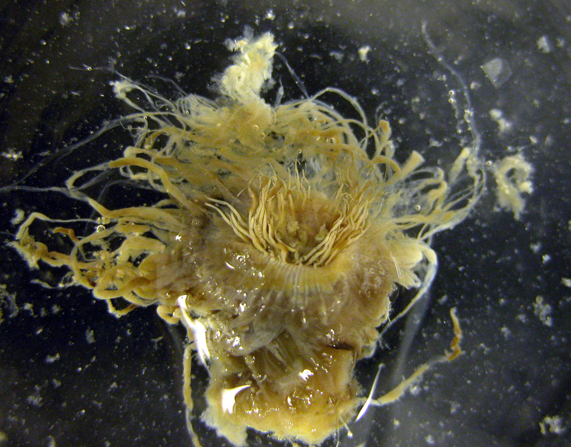 The most popular cnidarians are jellyfish and comb jellies.  Although these taxa are difficult to significantly quantify in our diet analyses, we have some evidence of jellyfish being eaten by butterfish, harvestfish, and Atlantic spadefish.  Cnidarians also include sea anemones and hydroids, which we occasionally identify in winter flounder diets and even less frequently in a few other species.  Massive colonies of hydroids are frequently encountered in the trawl net during our monitoring cruises.  We categorize these colonies as habitat, so perhaps it's safe to assume a predator was foraging in the habitat targeting more definitive prey items and ingested the hydriod incidentally.
