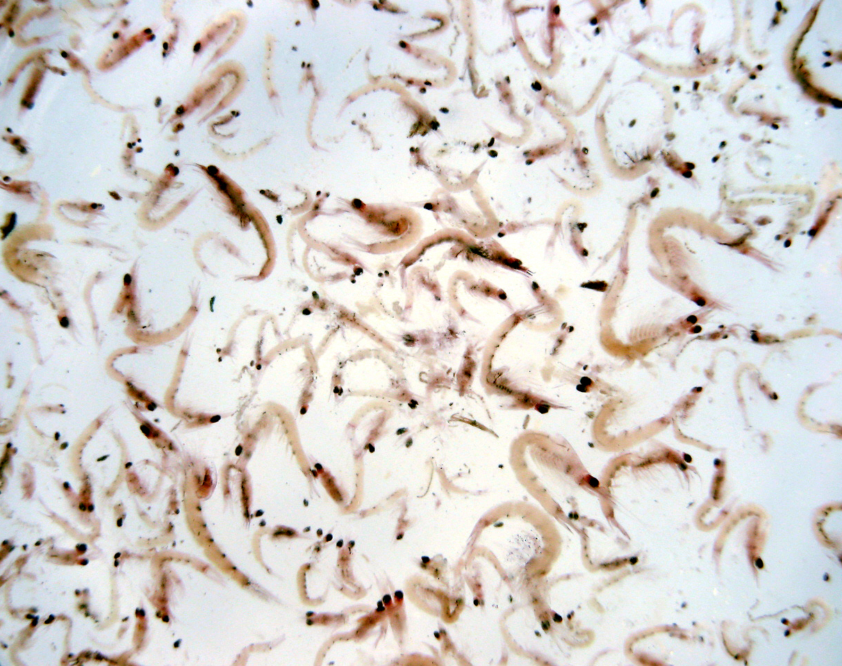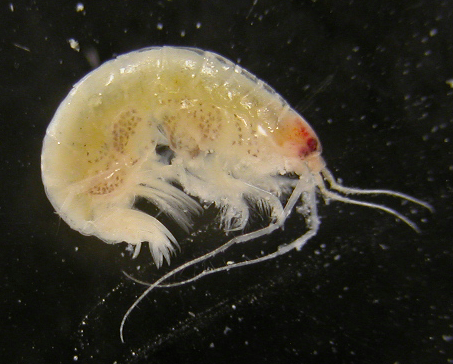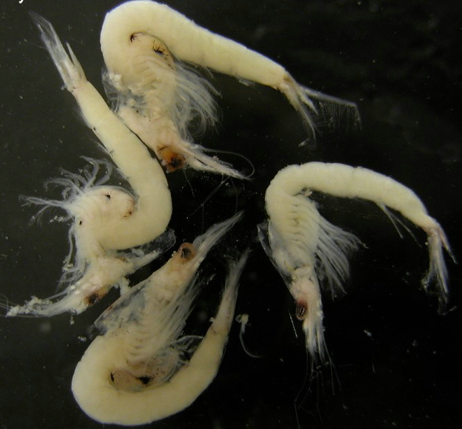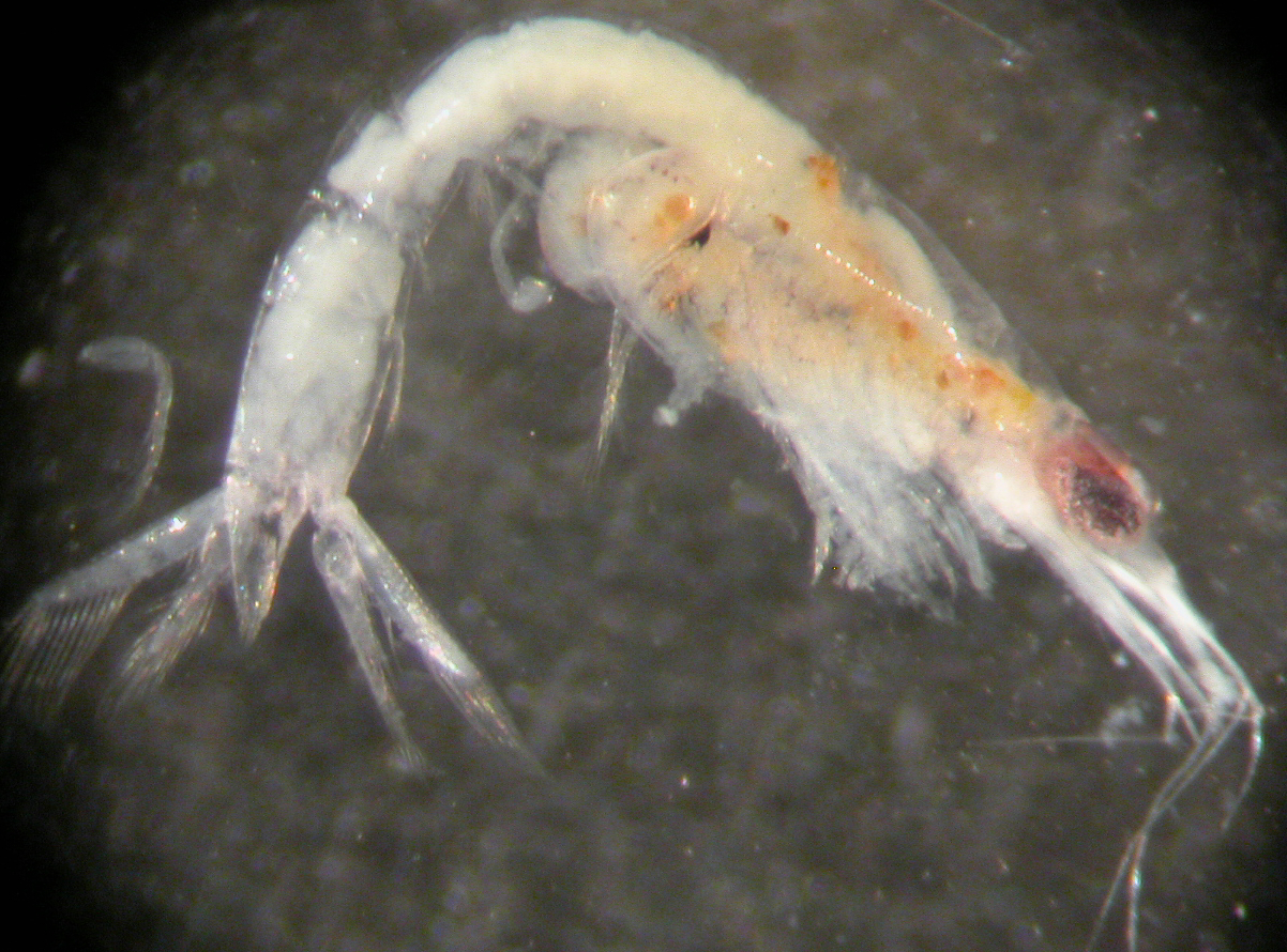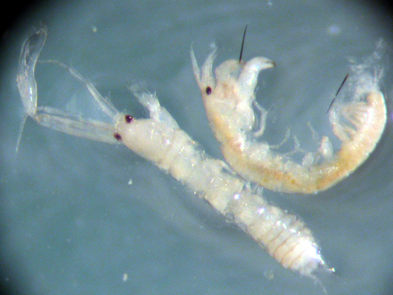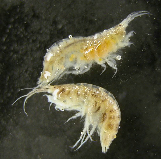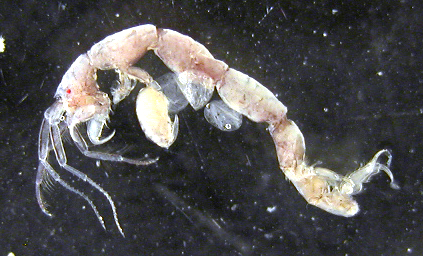 Usually no bigger than a fingertip, amphipods are small crustaceans that form a very important prey base for our small and juvenile fishes.  Most of the amphipods we identify are laterally flattened, like the common burrower amphipod and four-eyed amphipod.  Some are dorso-ventrally flattened, like Corophium spp.  Also classified as amphipods are the unique skeleton shrimp, commonly found in stomachs of structure- or seagrass-associated predators.