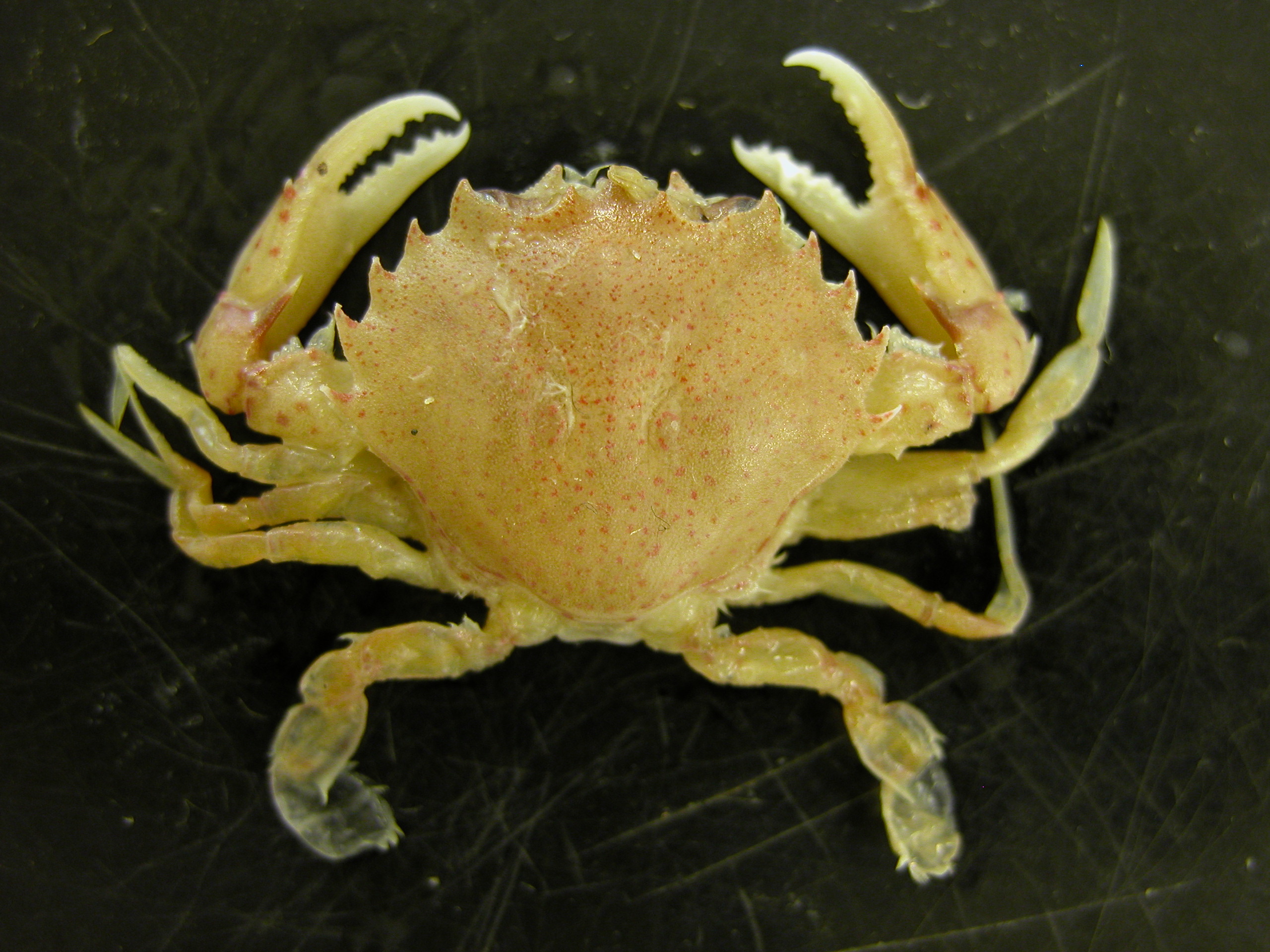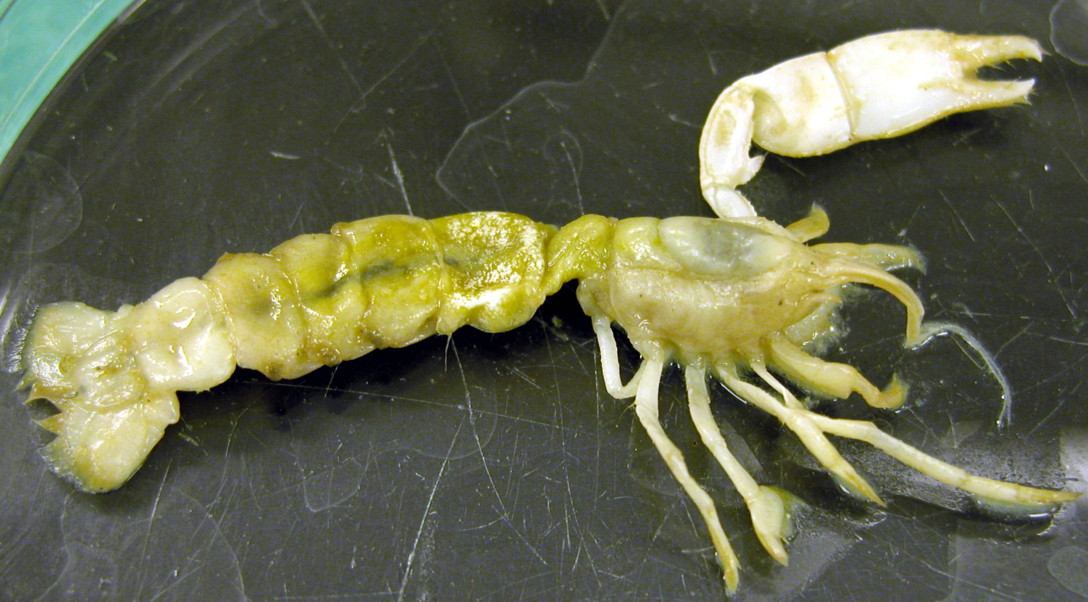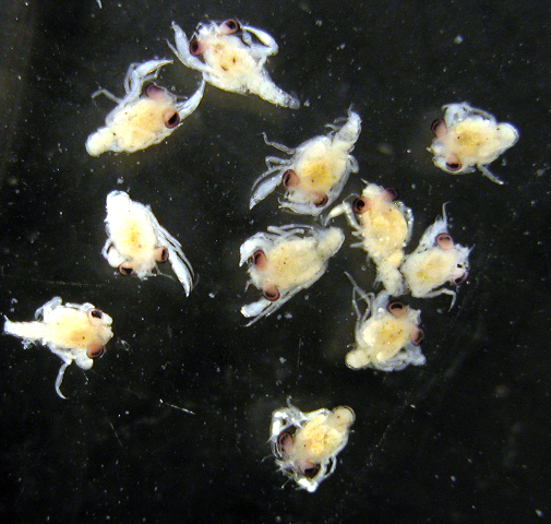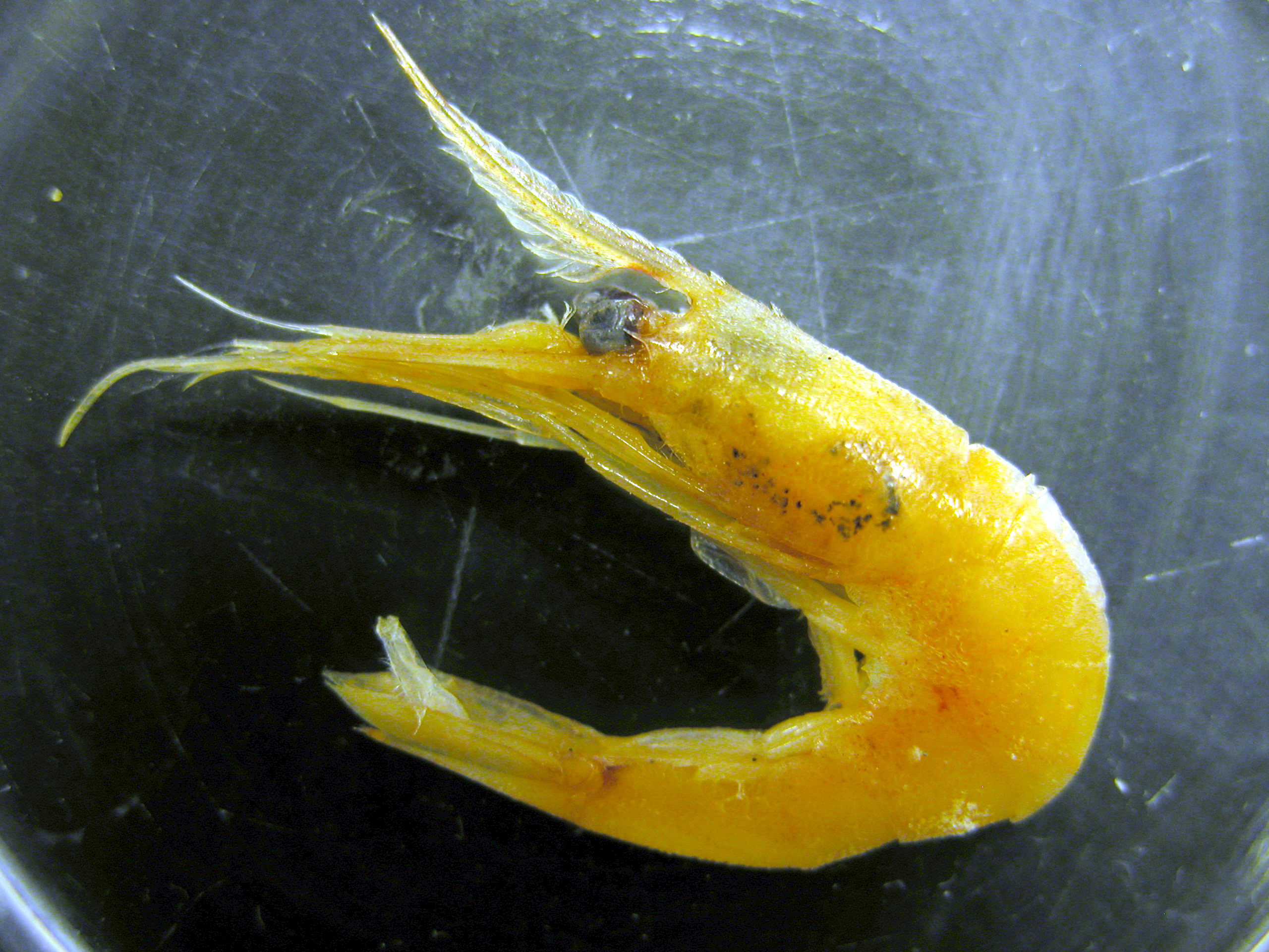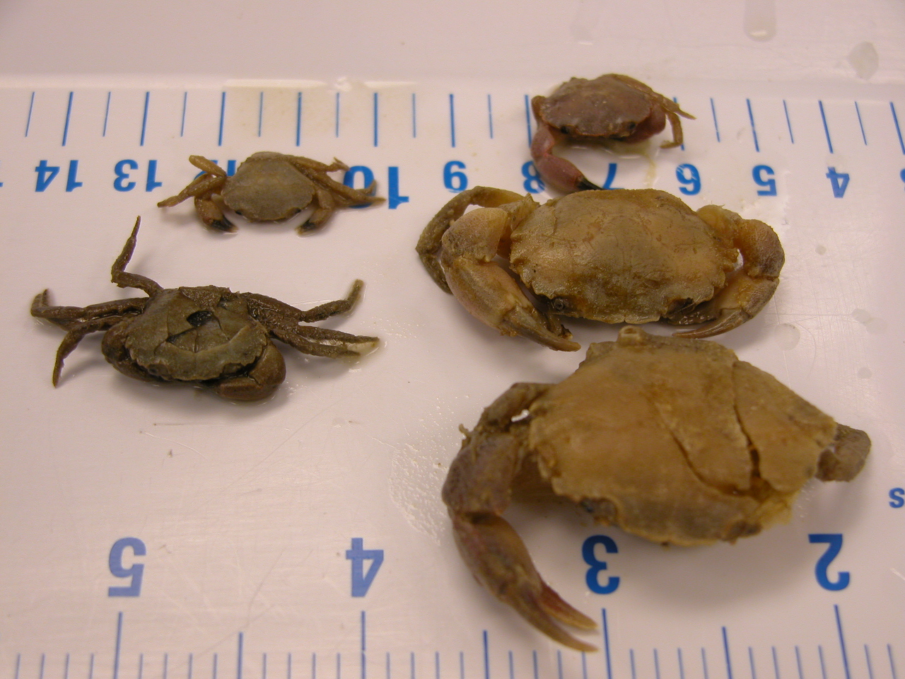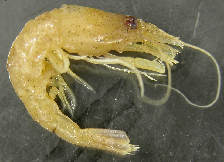 Decapods encompass the very large group of crabs, shrimps, and lobsters.  These are some of the most important prey types for a diverse array of predator species of various life history stages.  The most frequent decapod we encounter in fish stomachs is sand shrimp, a small shrimp whose presence is nearly ubiquitous in the diets of fishes of all sizes.  Other common shrimp we encounter are the long-eyed estuarine shrimp, bristled longbeak, roughneck shrimp, and short-browed mud shrimp.  Mud crabs are consumed by Chesapeake Bay species, while fishes in our nearshore Atlantic habitat consume Atlantic rock crabs.  Hermit crabs and lady crabs are commonly eaten by fishes in both habitats.  Decapods are even consumed as larvae, called zoea or megalopae, in the zooplankton along with copepods, by the smallest fishes.