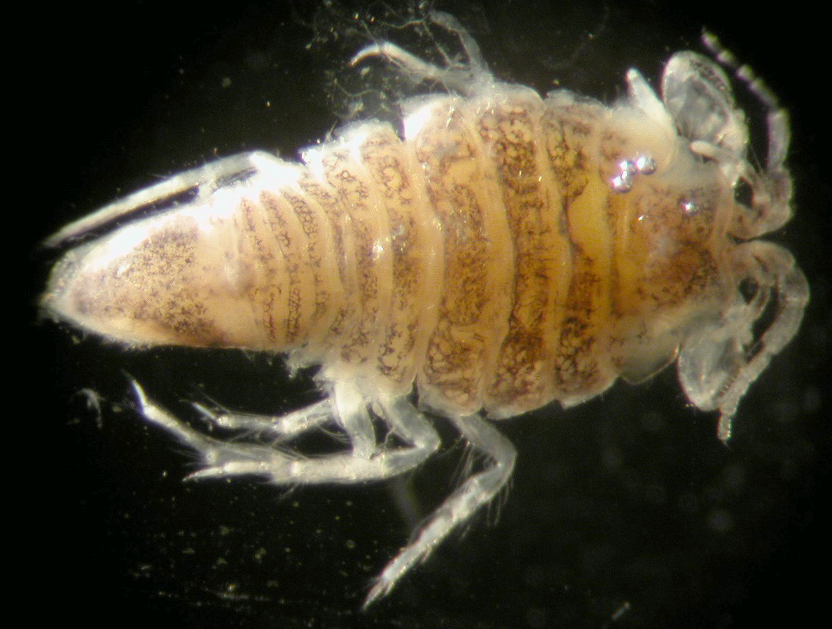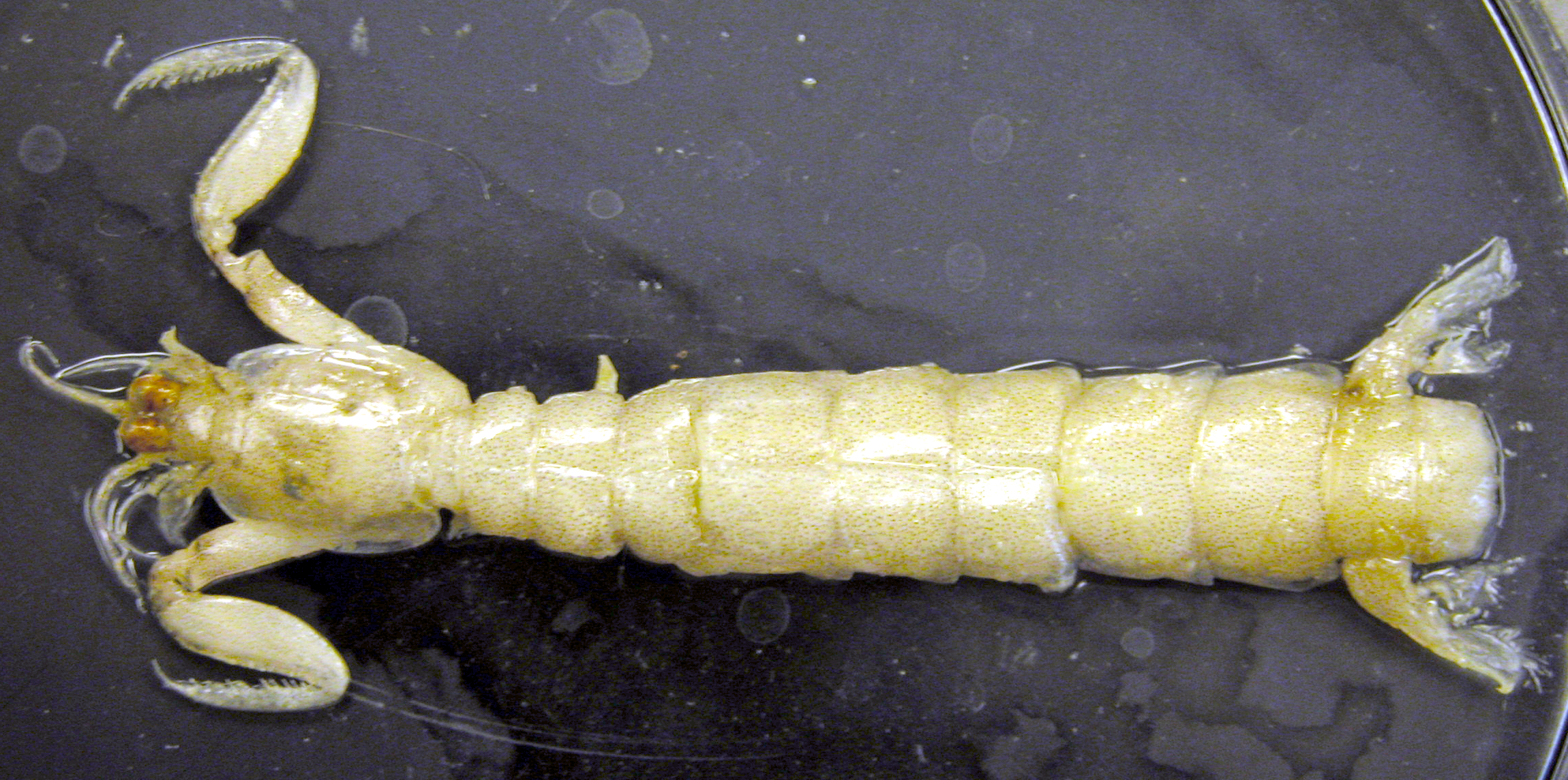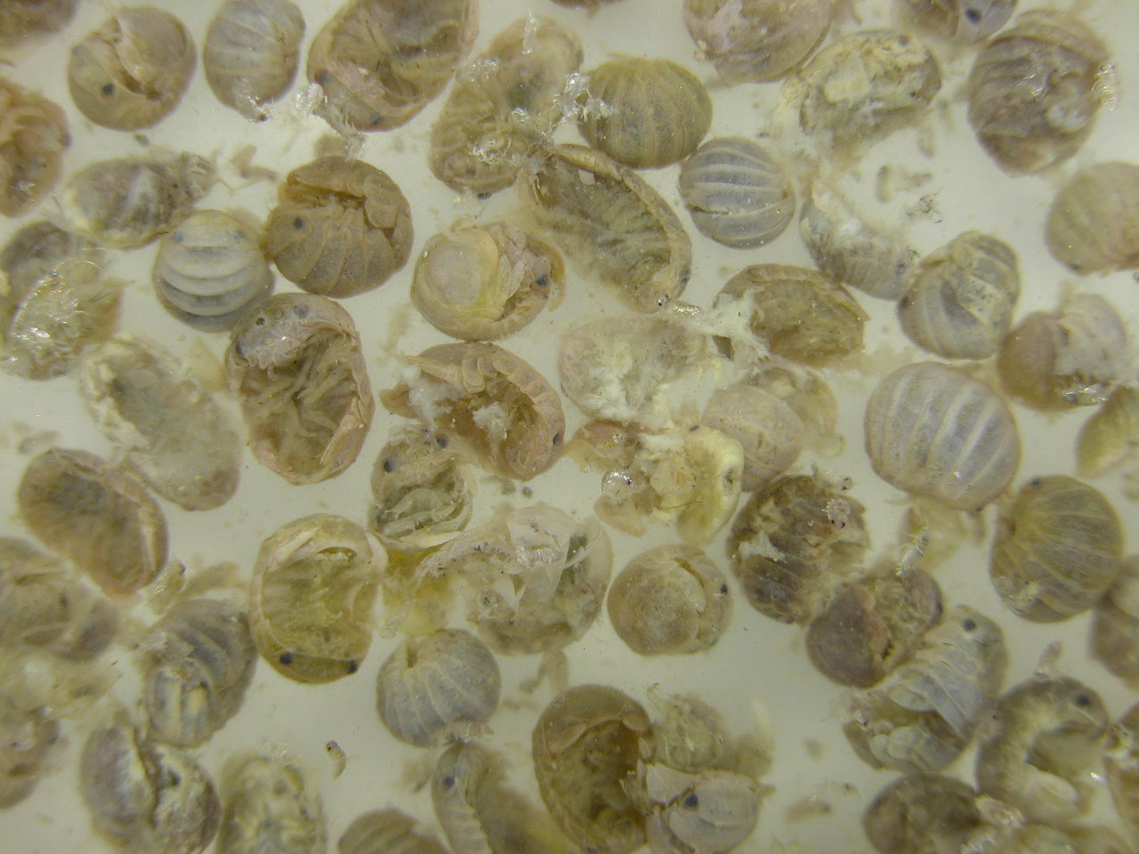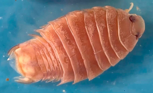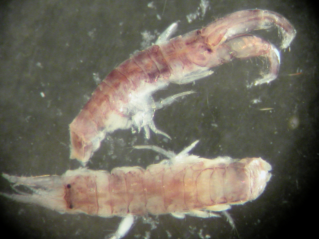 Isopods, like amphipods, are small crustaceans that resemble the pill bug you see on land, but are obscure enough that many do not have common names.  We find them mainly in the diets of smaller fishes.  They are generally larger than amphipods and are always dorso-ventrally flattened.  Isopods differ in appearance between the species enough that they usually can be positively identified.  The most commonly identified isopod in our nearshore Atlantic stomach samples is Politolana concharum.  In the Chesapeake Bay, interestingly, the most common isopod identified is a  parasitic species, Livoneca redmanii.  The mound-back isopod, slender isopod, Chiridotea spp., and Sphaeroma quadridentatum are also common prey items.
