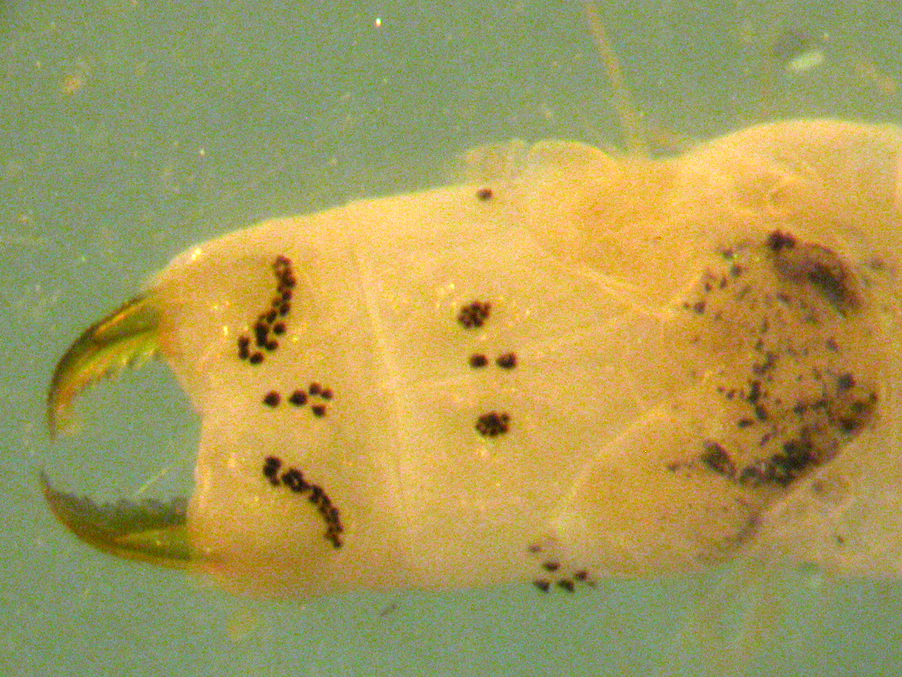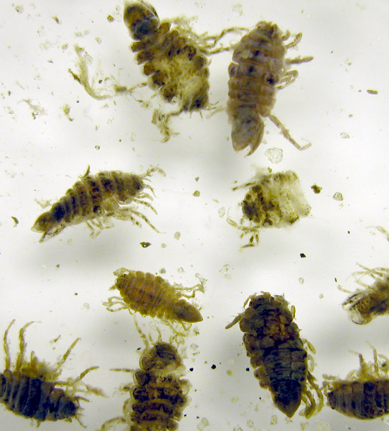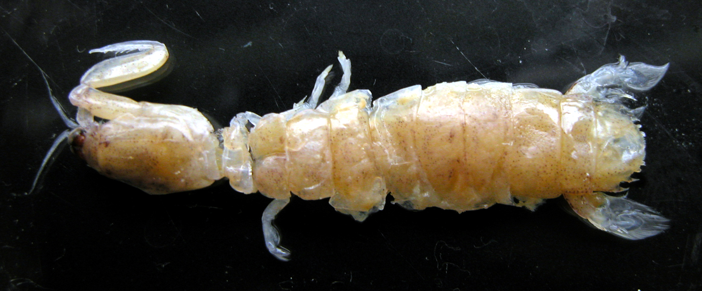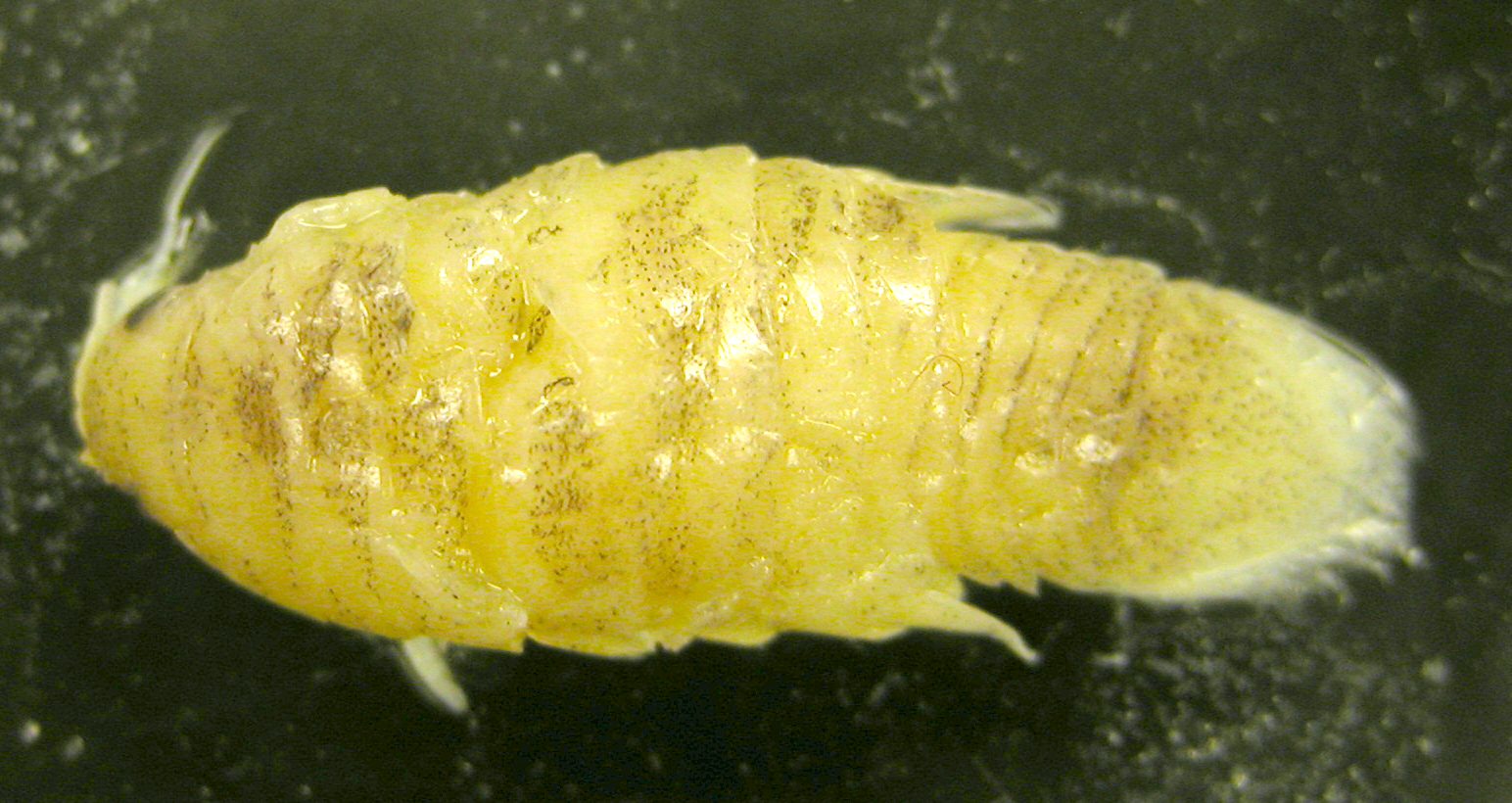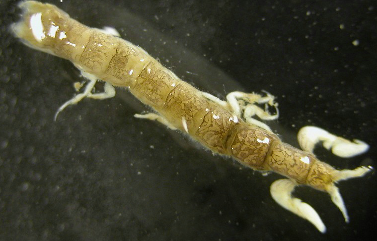 Isopods, like amphipods, are small crustaceans that resemble the pill bug you see on land, but are obscure enough that many do not have common names.  We find them mainly in the diets of smaller fishes.  They are generally larger than amphipods and are always dorso-ventrally flattened.  Isopods differ in appearance between the species enough that they usually can be positively identified.  The most commonly identified isopod in our nearshore Atlantic stomach samples is Politolana concharum.  In the Chesapeake Bay, interestingly, the most common isopod identified is a  parasitic species, Livoneca redmanii.  The mound-back isopod, slender isopod, Chiridotea spp., and Sphaeroma quadridentatum are also common prey items.