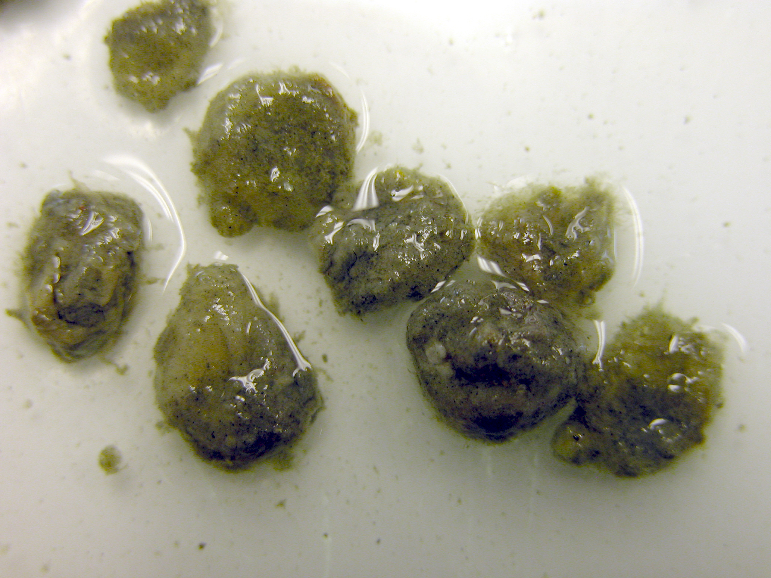 Otherwise known as sea squirts, tunicates are colonies of indivuals whose size varies from species to species.  Although tunicates are relatively rare in our fish diets, the genus we most frequently encounter is Molgula, which has large and globular individuals.  Rarely, we will encounter a stomach containing eelgrass with a tunicate colony encrusting it.  When we find Molgula in fish stomachs it is unclear whether they are incidentally ingested by the predator or being targeted as prey.  Massive colonies of Molgula are frequently encountered in the trawl net during our monitoring cruises.  We categorize these colonies as habitat, so perhaps it's safe to assume a predator was foraging in the habitat targeting more definitive prey items and ingested the tunicate incidentally.