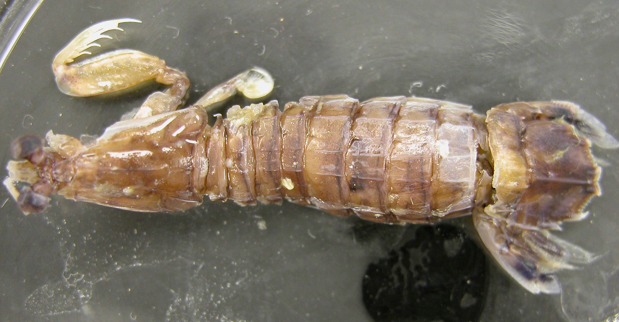 Stomatopods are an important prey type for larger age class predators in both the Chesapeake Bay and nearshore Atlantic habitats.  Stomatopods, also called "mantis shrimp", are crustaceans, but are not true shrimp, which are decapods.  Stomatopods are quite distinct from shrimp in that they are dorso-ventrally flattened and have distinct head, body, and tail regions.  While we do find stomatopod larvae, and smaller juvenile specimens, we encounter adult forms greater than 8-10 cm most frequently.  In Chesapeake Bay, we identify exclusively Squilla empusa, and in the nearshore Atlantic, we have found Nannosquilla grayi, and Platysquilloides enodis.