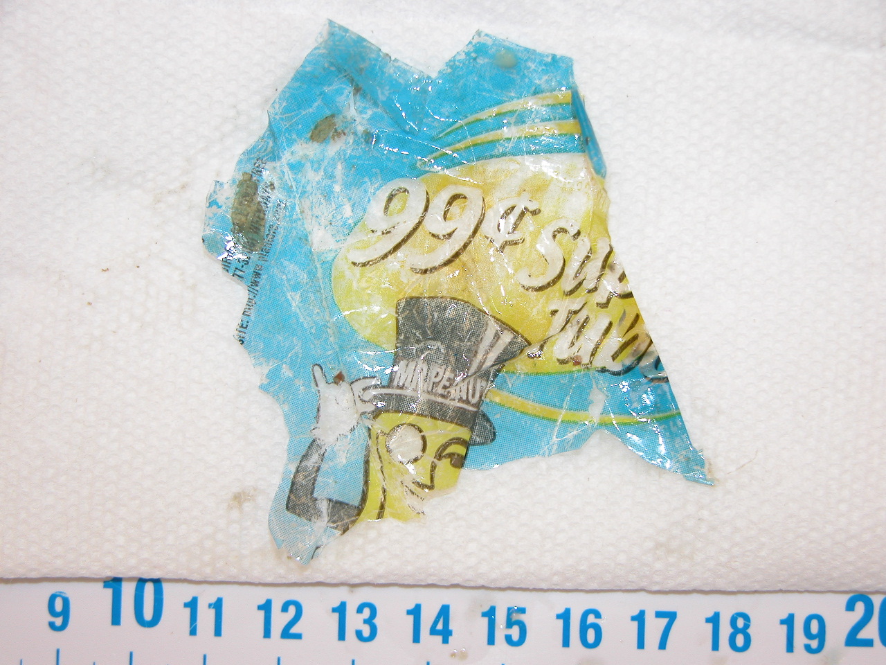 Anything we cannot identify as animal or plant, or cannot differentiate as animal or plant from other unidentified material in the stomach contents is classified as miscellaneous.  Included in the miscellaneous category are any animal or plant parts that are too digested to identify as such; mineral material like rocks, sand, or mud; other organic material or detritus; animal tubes; and artificial material such as trash or fishing lures.  Artificial material is relatively rare, but always interesting to find.