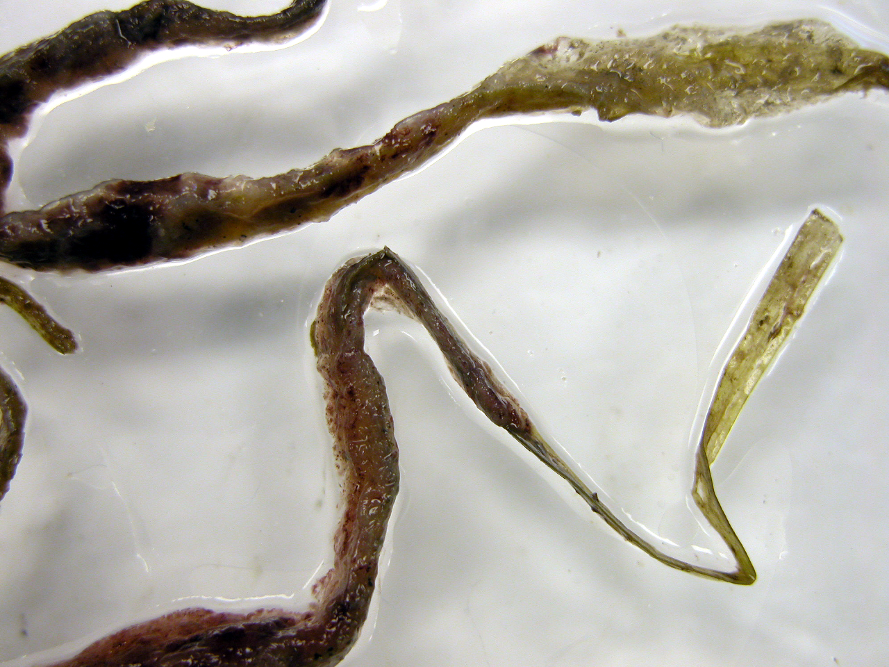 Any type of vegetation we find in stomach samples is grouped into the plant category.  We can identify sea grasses, seaweed or macro algae, leaves, and seeds if they are in good shape, but most often the vegetation remains unidentied or identified as detritus.  It is unknown whether our fishes deliberately consume the vegetation for nutrition, but it seems more likely the plants are ingested with animal prey using it as habitat.  Plant material identified in our fish diets is relatively uncommon, but we have quantified some in winter flounder, winter skate, smooth dogfish, and Atlantic croaker.