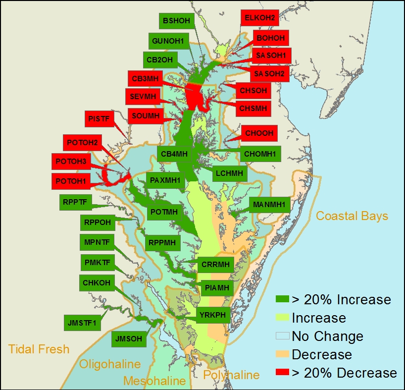 | ▲ 20%, Mouth of the Choptank River (CHOMH1), 2933 ha (2016) vs. 3527 ha (2017) |